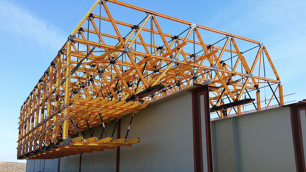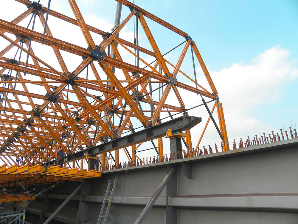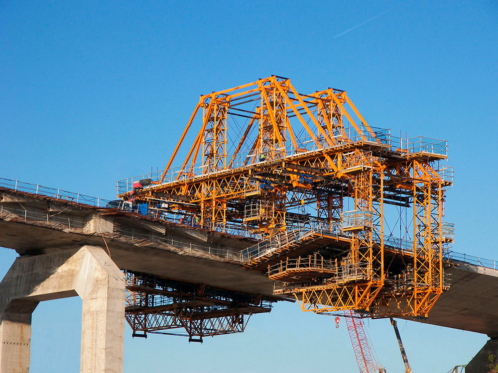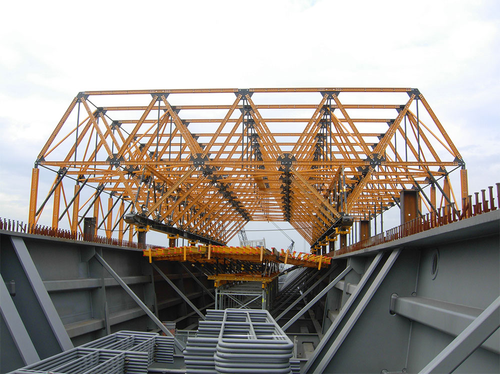 - O conjunto se apoia sobre um trilho que avança sobre os elementos de rodagem dispostos ao longo da ponte