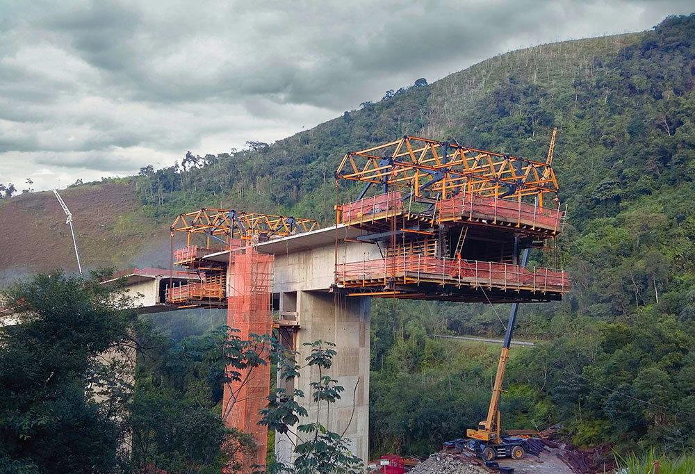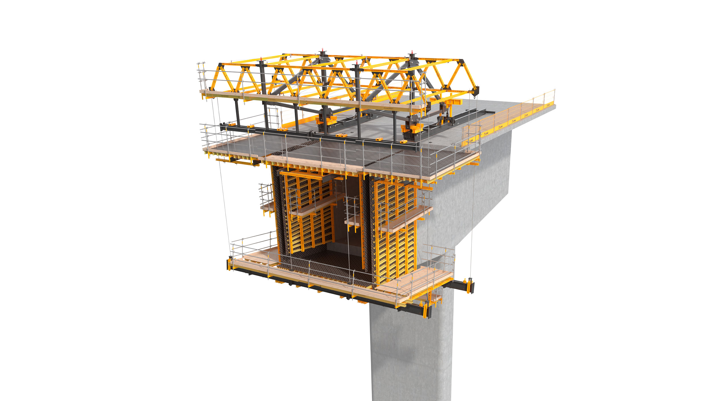 Sistema de Balanço Sucessivos para construção de aduelas moldadas in-loco, que se adapta a qualquer geometria e dimensão de aduela, que agiliza o processo de movimentação e nivelamento das cofragens e otimiza os recursos auxiliares (libera o uso da grua para outras atividades da obra).