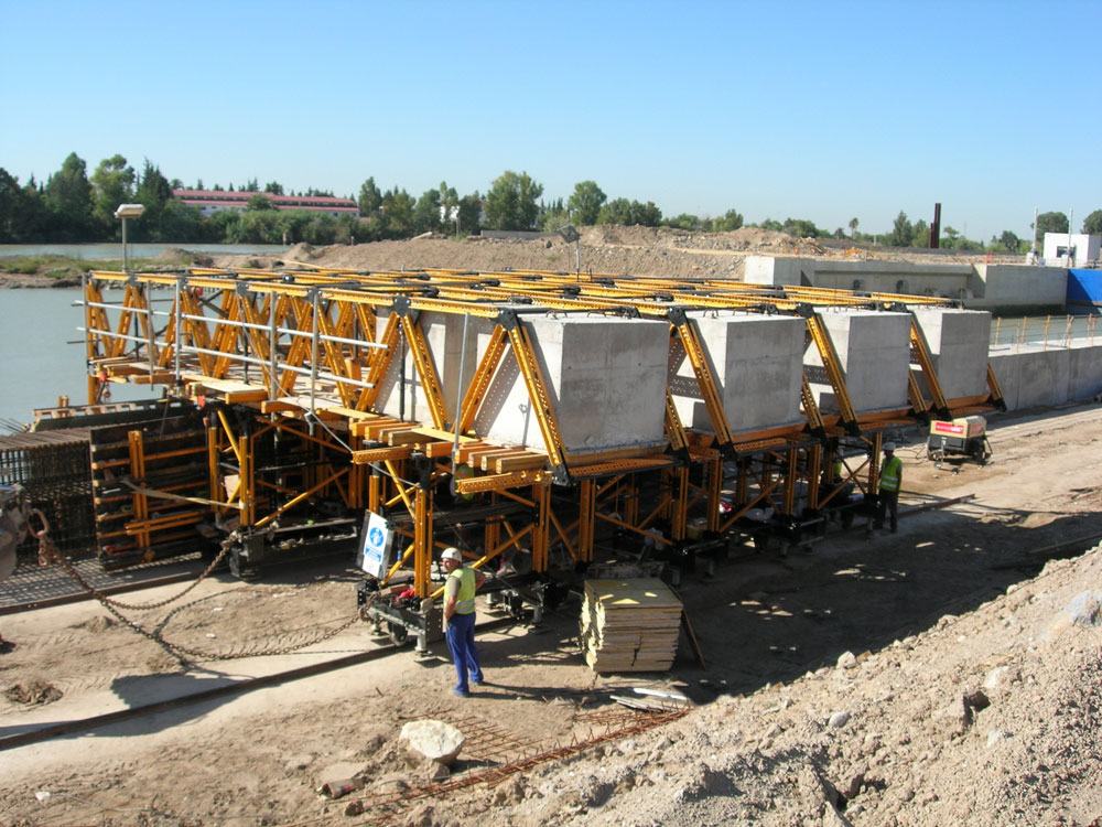 - Sistema de rodagem e nivelamento: Conjunto de elementos que permitem o movimento da treliça e seu nivelamento no ponto correto e descofragem.
