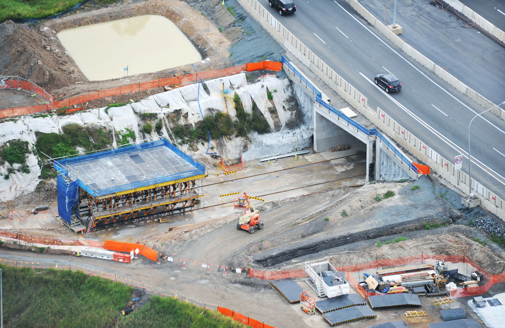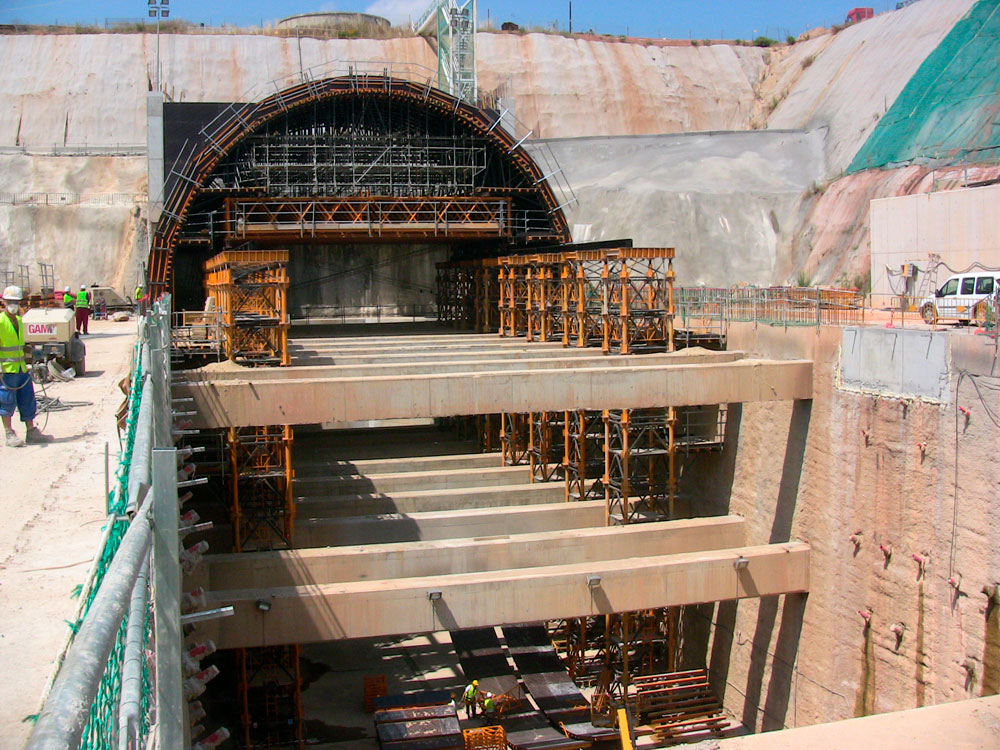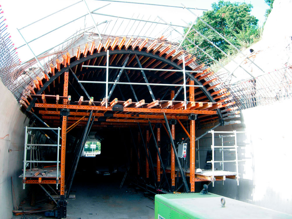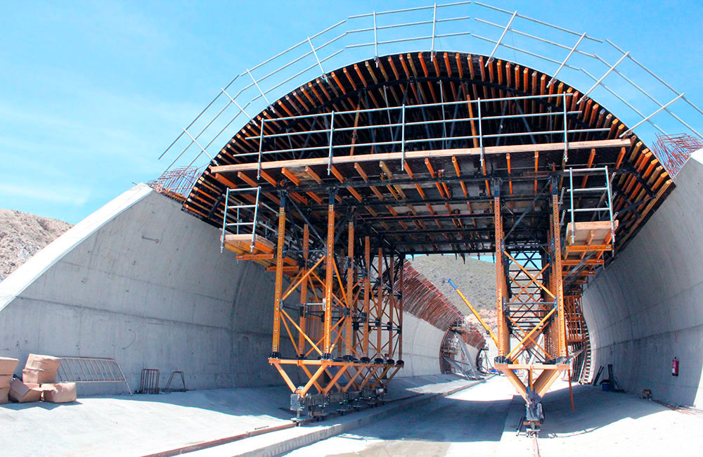 Carro móvel desenvolvido para construção de Túneis a céu aberto ou falsos túneis. Combina a estrutura de apoio que dá formato a abóboda.