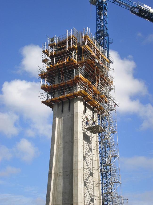 Configuração de console do sistema autotrepante. Recuo mediante carros (70 cm), sobre o próprio consola. Elementos de regulagem para aprumar e posicionar a cofragem horizontal e verticalmente. Duas plataformas, principal de trabalho (largura 2,5 m) e para acionamento do sistema hidráulico. Outras 3 possíveis plataformas para betonagem, recuperação de elementos e outras tarefas.