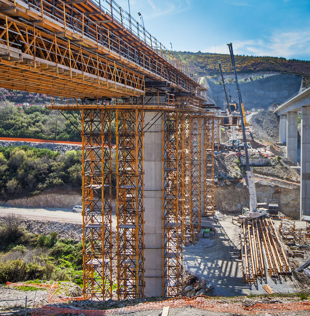 É um escoramento modular que oferece uma alta produtividade no suporte de grandes cargas, com alturas elevadas e grandes vãos entre apoios.