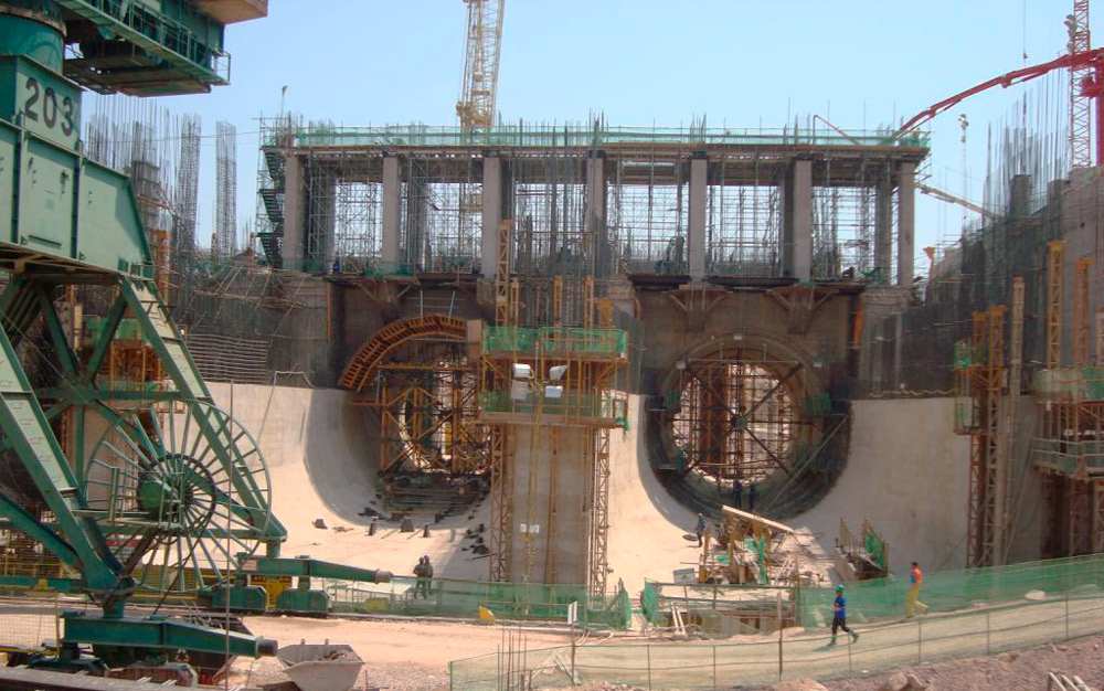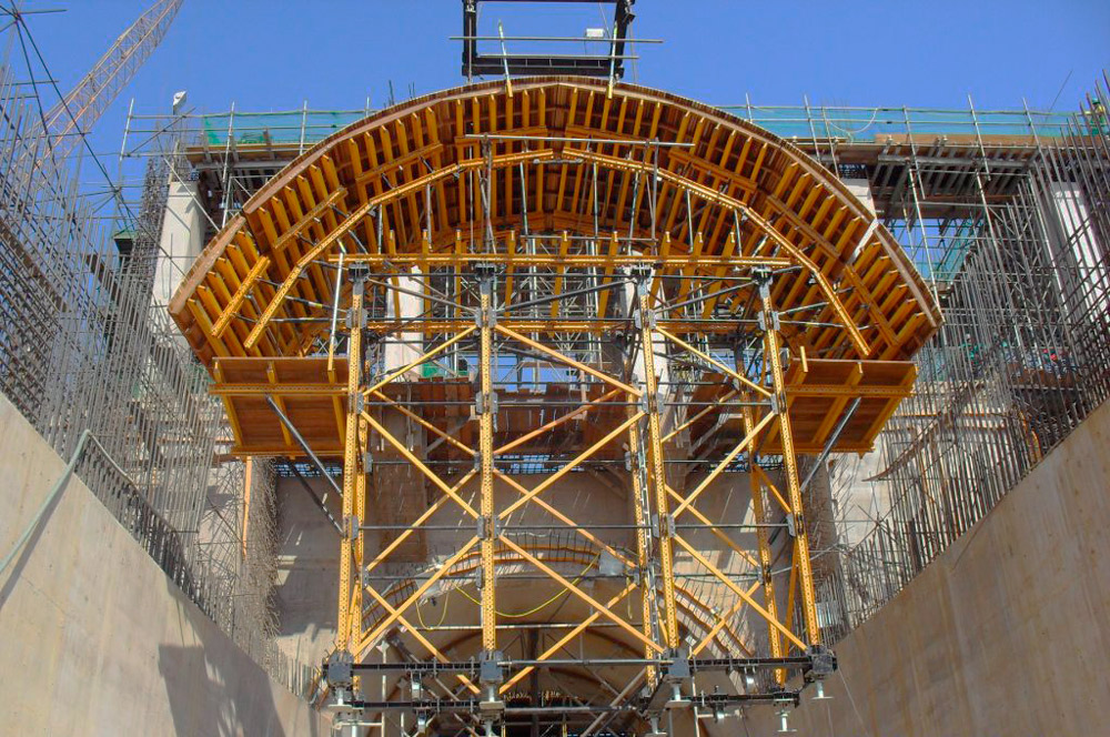 Para lidar com as dimensões das estruturas da tomadas de água (18 m de altura e 2,5 m de espessura de betão), foram utilizadas duas torres móveis conjugadas de Cimbre MK-360 e cofragem ENKOFORM HMK e VMK. Além disso, a tarefa de montagem e desmontagem foi simplificada, graças ao sistema de movimentação sobre rodas do carro para nova área de utilização.