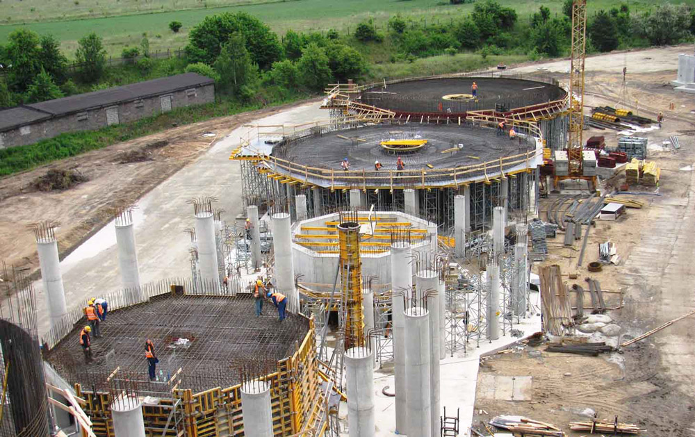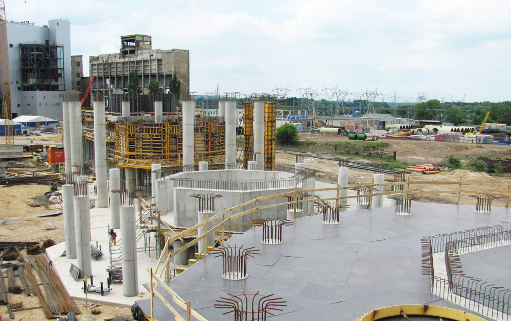 As muros dos silos (15 m) foram realizadas em três fases, com altura de cofragem de 6 m (2 x 3 m) nos dois primeiros e de 3 m na última.