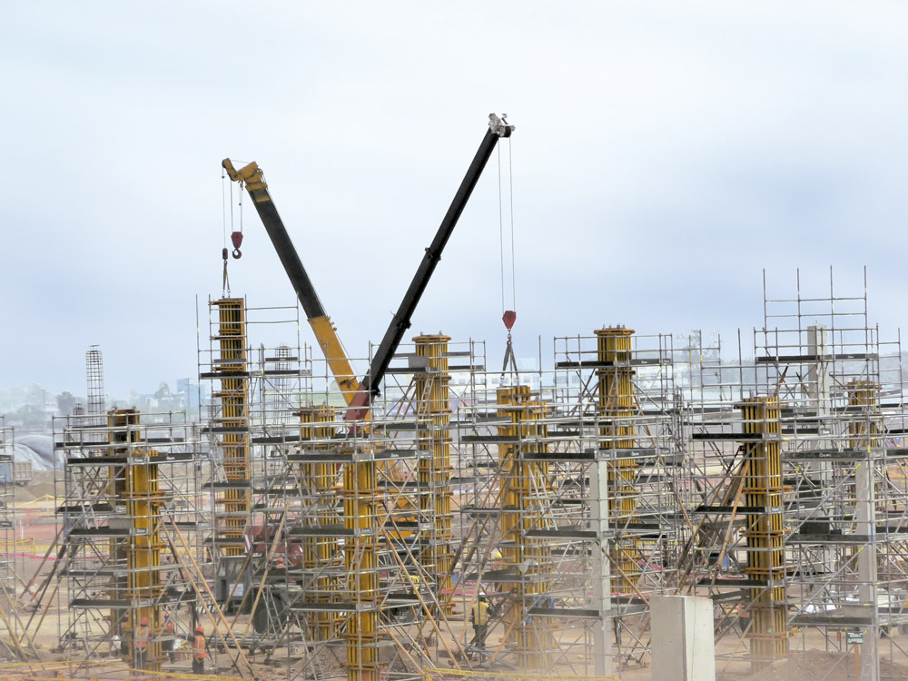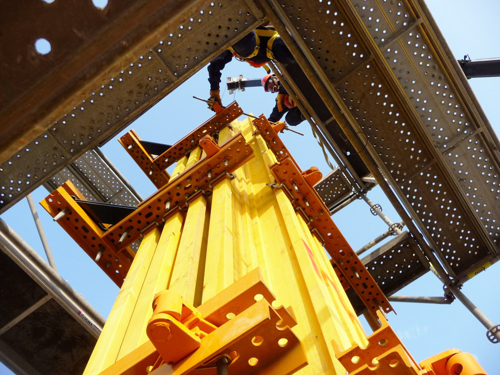 A cofragem completa de cada pilar foi elevada, dividida em dois “L”, por meio do Gancho Elevação E V-100 e uma grua, realizando a elevação de forma segura.