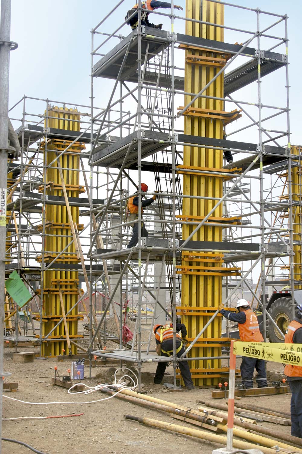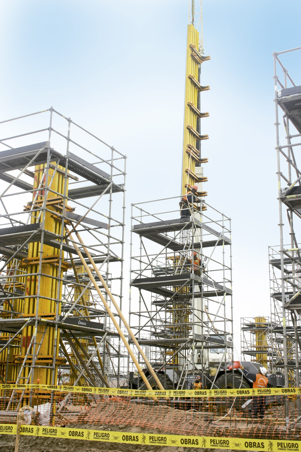 Para realizar os trabalhos de armação, montagem e desmontagem das cofragens foram utilizadas as plataformas de trabalho do Andaime BRIO. Este sistema garante a segurança do montador e do usuário em todos os momentos, além de poder ser deslocado por meio de grua sem ser desmontado.