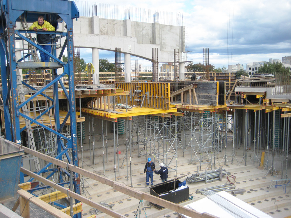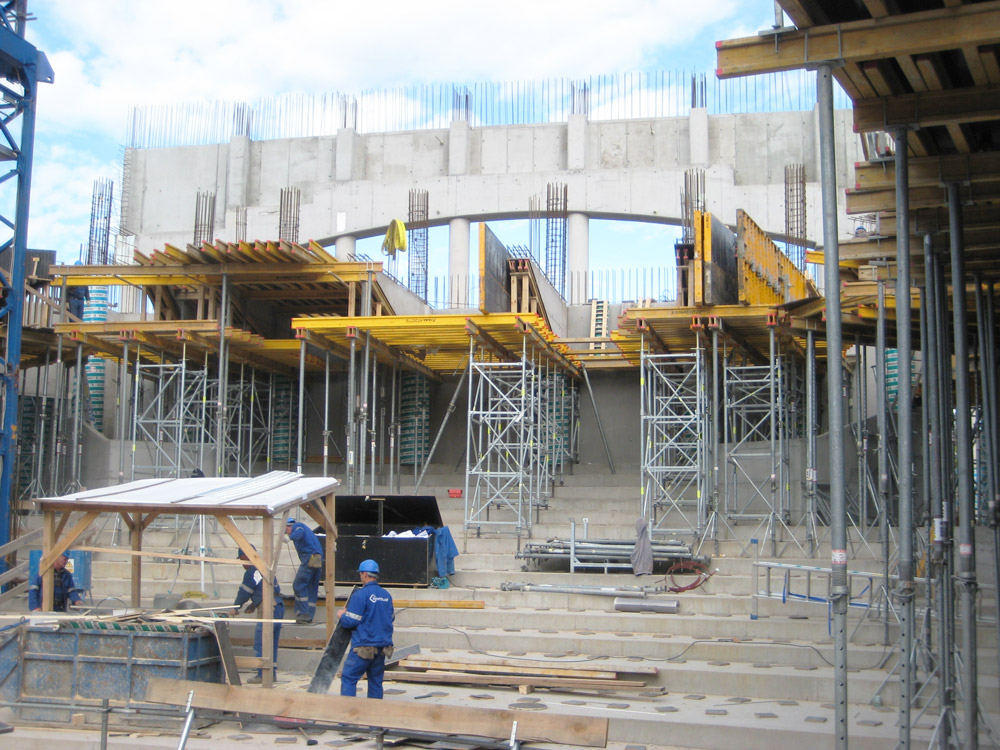 Para a execução da primeira fase da estrutura do edifício principal (com uma superfície útil de 9.424 m², área construída de 6.302 m² e salas com capacidade para 1.000 e 200 lugares), realizou-se o fornecimento global de cofragens. Na maior parte do projeto foi utilizada a tecnologia de betão arquitetônico.