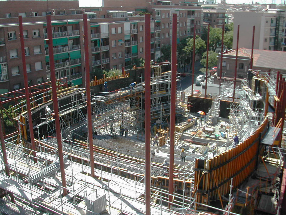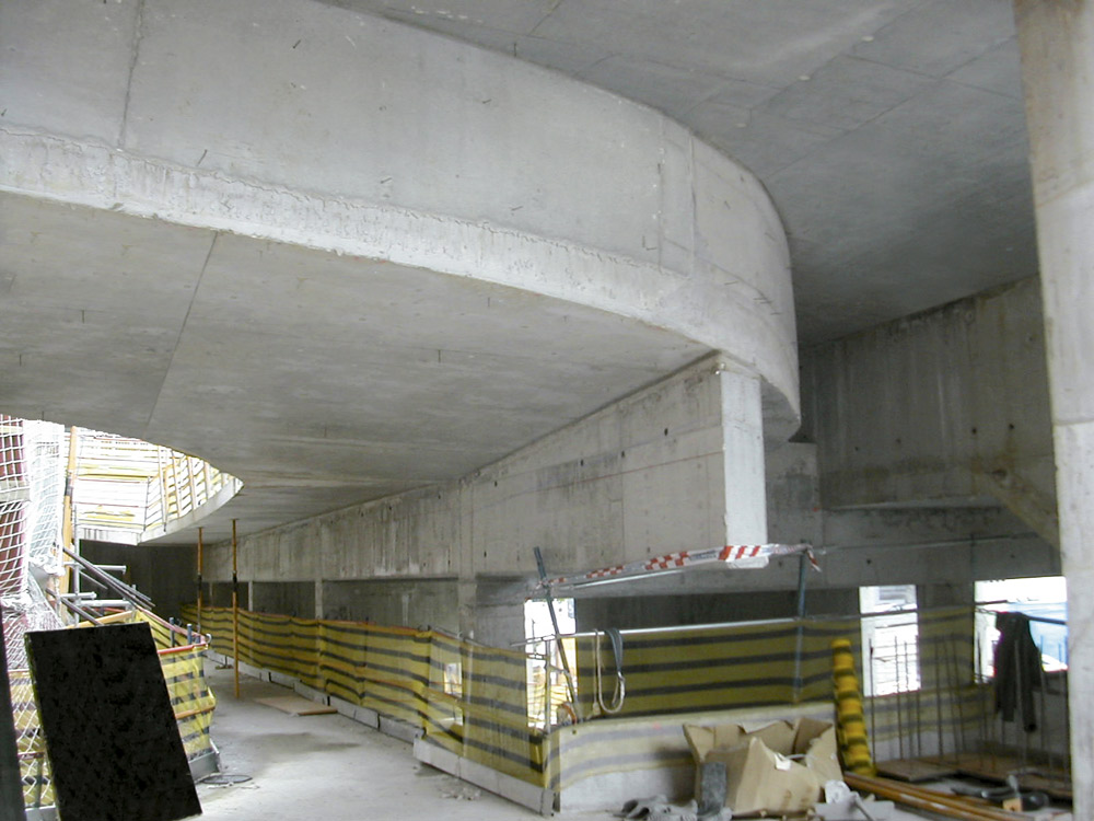 Para solucionar a construção das muros, foi aplicada a Cofragem ENKOFORM V-100 nas superfícies verticais curvas e em algumas inclinadas. Parte deste sistema foi montado no local, e o restante foi enviado para a obra pré-montado. A adaptação às diversas formas da estrutura às fortes pressões de betonagem foi perfeita.