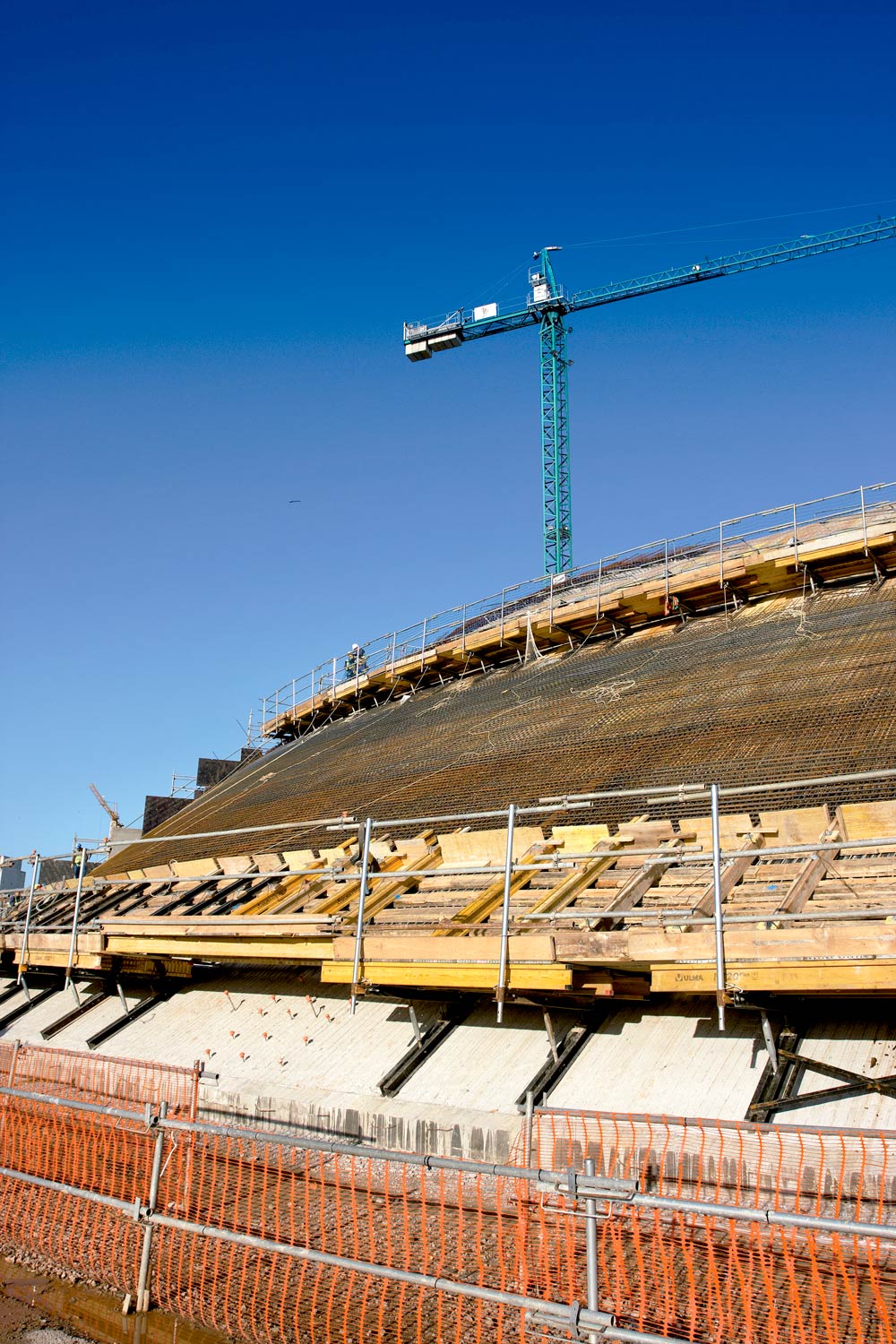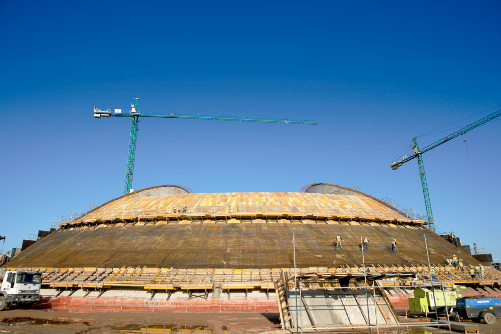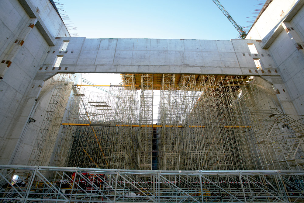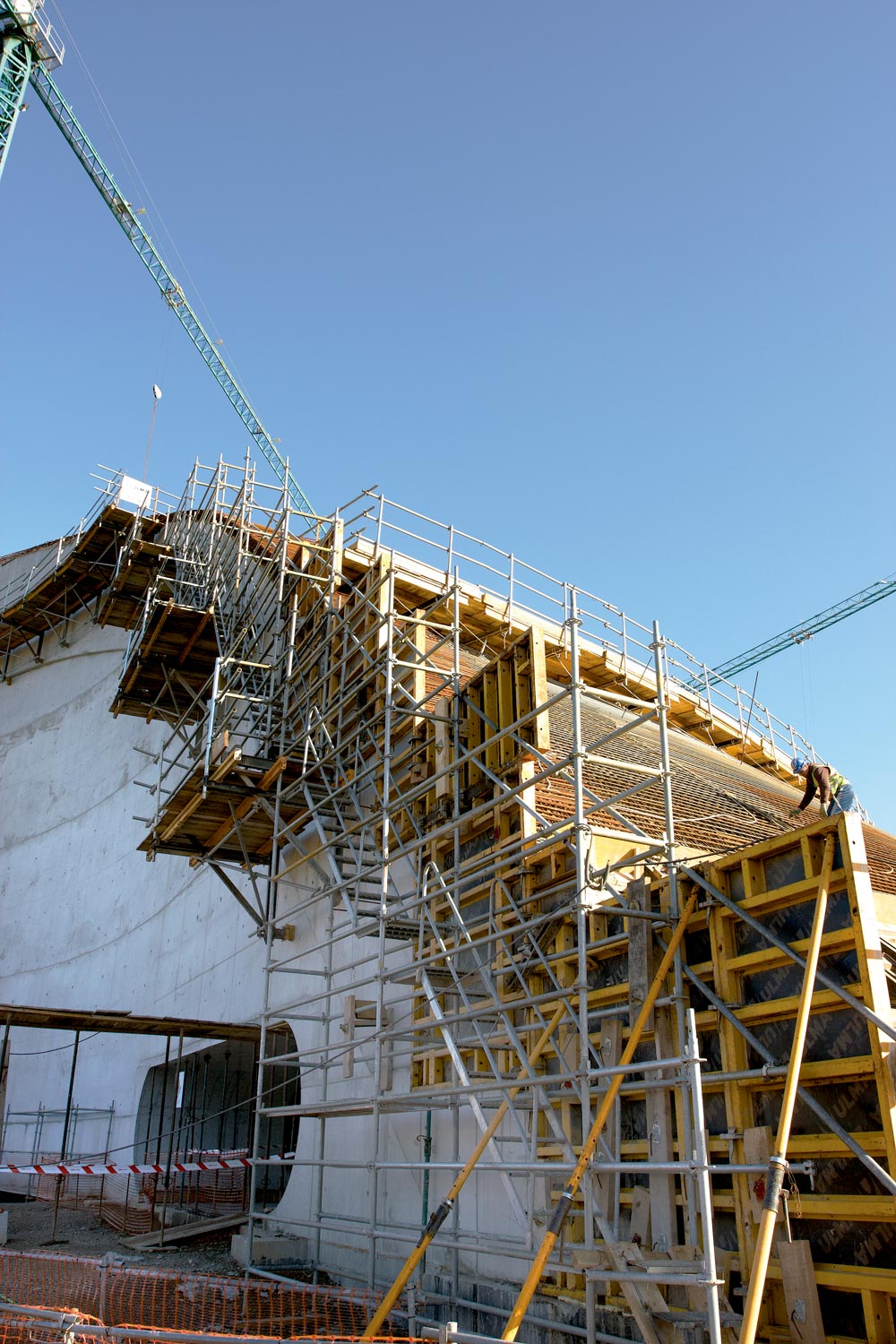 Para os trabalhos na cobertura, tendo em conta a sua especial geometria, as alturas requeridas, assim como a mudança de espessura na laje a partir da zona de cenário, optou-se pelo sistema de Cimbre T-60 que proporcionou a flexibilidade em uma obra deste tipo. Além disso, demonstrou a sua capacidade de adaptação a qualquer forma, através da distribuição de torres individuais ou agrupadas e a sua grande capacidade de carga como sistema de escoramento.