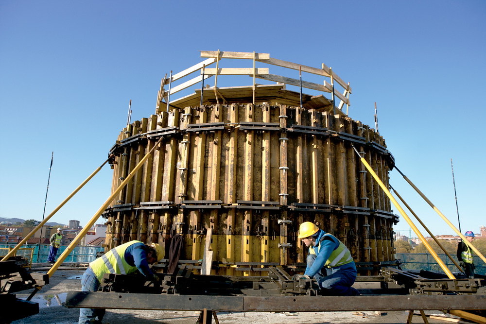 As onduladas silhuetas dos edifícios exigiram um estudo detalhado para solucionar as muros, tanto de geometria reta, como em curva, para obter um perfeito acabamento de betão visto. A solução das muros retos foi executada com a Cofragem Modular ORMA, tendo-se utilizado para as muros curvos, de geometria variável, o sistema ENKOFORM V-100. Desta forma, rentabilizaram-se ambos os produtos, devido à possibilidade de combiná-los com a utilização de um mesmo grampo. A superfície da cofragem de painel fenólico, permitiu os acabamentos necessários em cada caso.