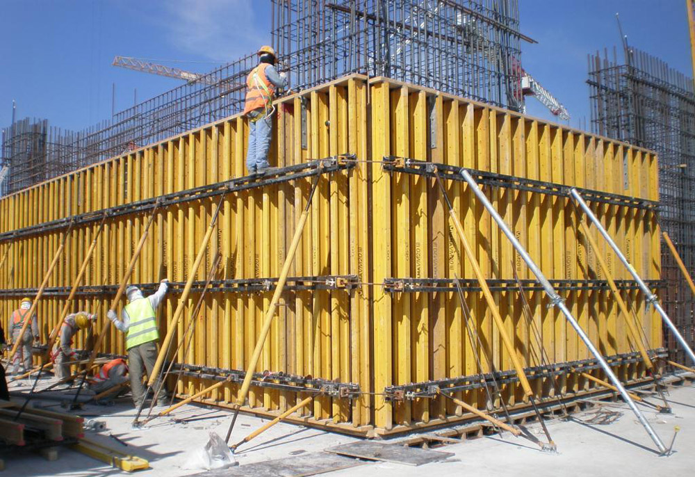A utilização de sistemas modulares, e de fácil montagem, permitiu reduzir os tempos da cofragem de lajes. Com as Mesas VR foram construídas as estruturas típicas com lajes de até 45 cm. Os altos desempenhos de execução ficaram demonstrados, já que após a montagem no início da obra, foram deslocadas para as diferentes aplicações sem serem desmontadas. Para as estruturas inferiores e para os remates foi utilizado ENKOFLEX uma vez que, graças à sua versatilidade, permitiu solucionar diferentes tipos de laje e alturas.