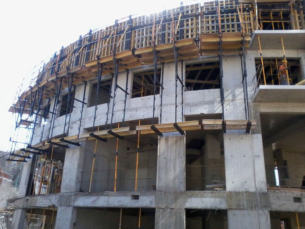 - ENKOFORM V-100 reto e curvo. Os painéis retos foram montados pelos operários da obra, treinados pelos supervisores da ULMA Argentina. Os painéis curvos foram pré-montados no depósito da ULMA Argentina por funcionários próprios e posteriormente na obra. Para conseguir chegar ao raio dos painéis foi montado o ENKOFORM reto e sobre essa base foram colocados vigas curvas sobre os quais se fixou os painéis fenólicos laminados de 1,22 x 2,44m e 12 mm de espessura, fornecidos pelo cliente.