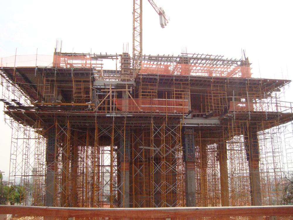 Em baixas alturas, as estruturas horizontais foram apoiadas com Prumos SP. Na zona perimetral e alturas superiores a das prumos, se utilizou o CIMBRE G. A geometria variável do edifício exigiu uma cobertura de vãos com vigas e perfis metálicos em posições variáveis em cada andar.
