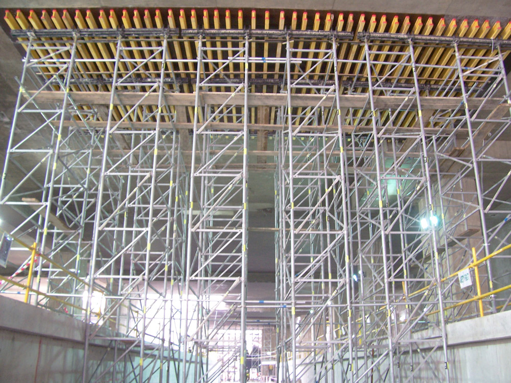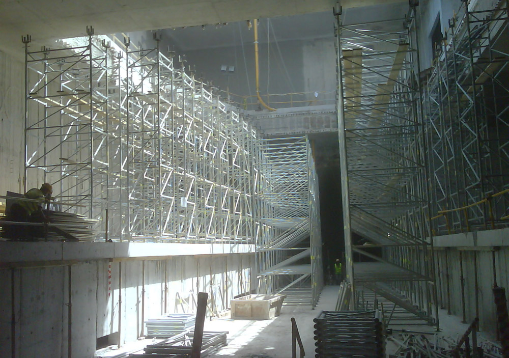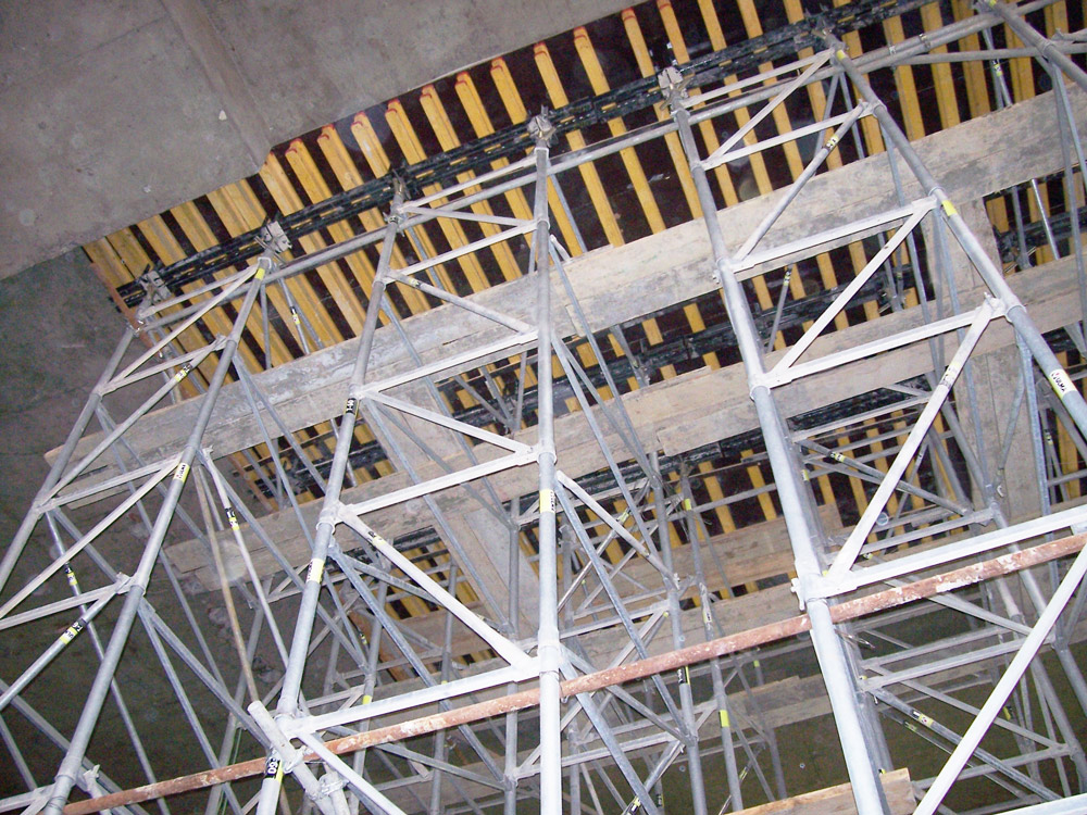 Como em todos os casos, tanto o Sistema ENKOFLEX como os restantes produtos instalados ofereceram os mais altos padrões de segurança e qualidade. A transmissão de cargas até uma altura de 12 m entre lajes foi realizada com torres de Cimbre T-60 em conjunto com Prumos EP. As torres de cimbre, de montagem rápida e simples, facilitaram o seu deslocamento de uma localização para outra, já que não foi necessário desmontá-las para utilização na aplicação seguinte.