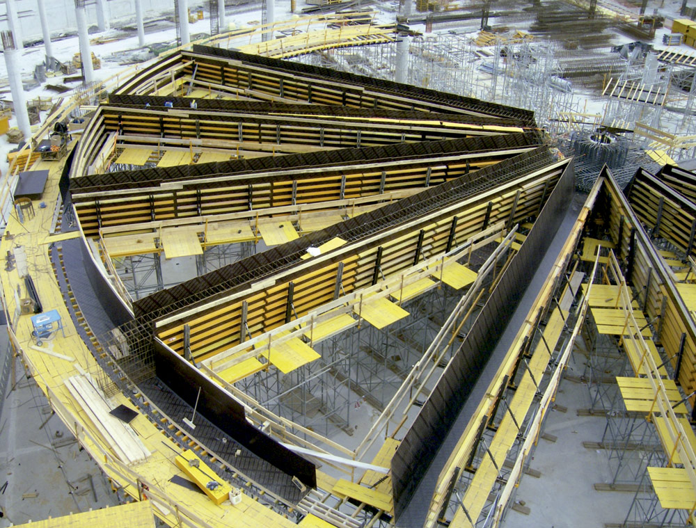 Na execução do núcleo central do edifício foi utilizado como cofragem das vigas o ENKOFORM HMK e como apoio, um cimbre modulado de modo a adaptar-se à geometria radial.