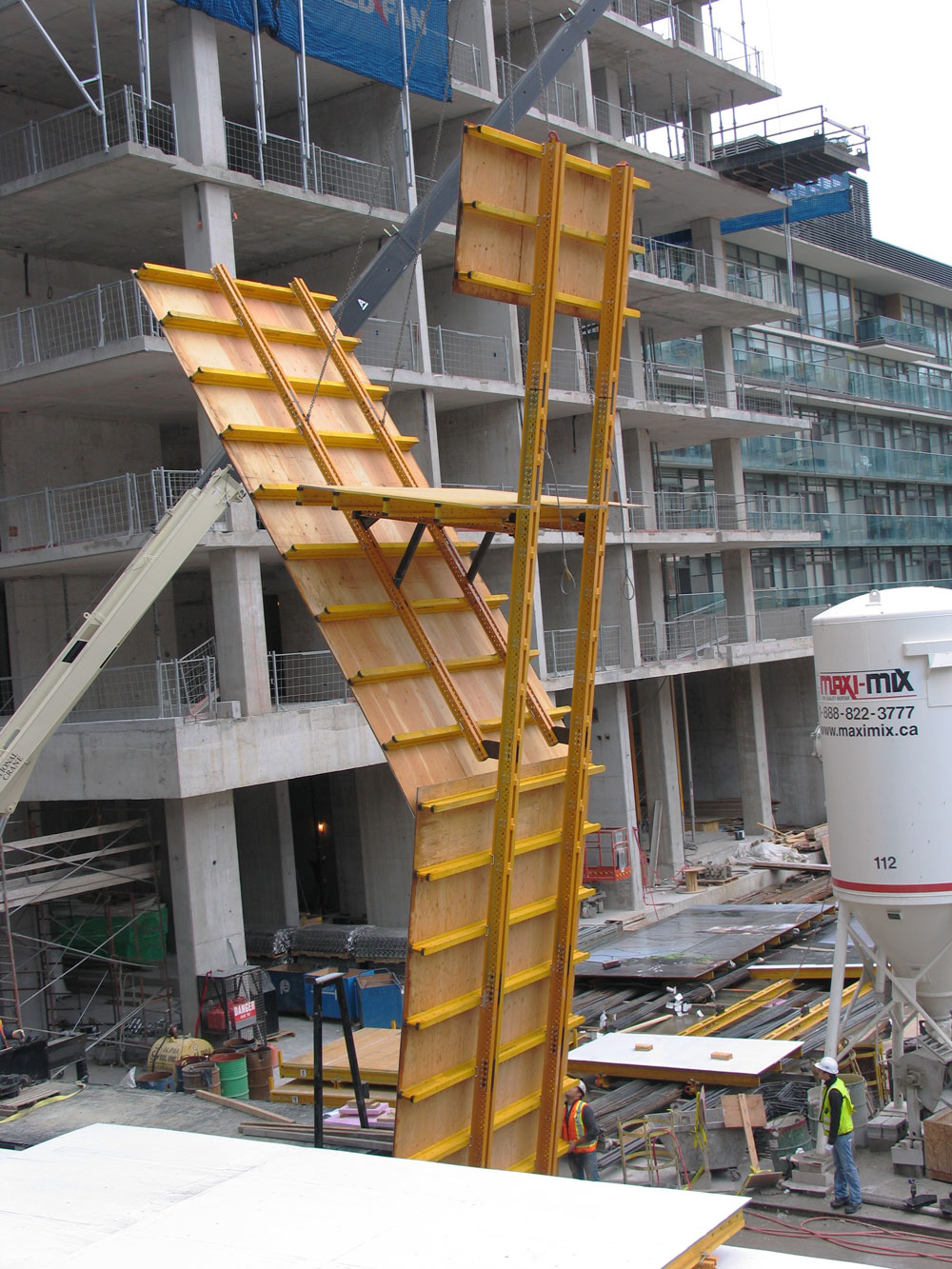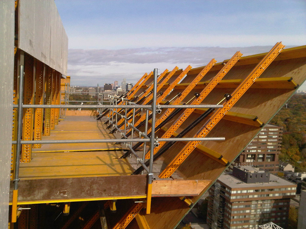 Nesta obra se utilizaram painéis inclinados com plataformas de armazenamento integradas, o que permite a passagem a outros andares do material já utilizado. No mais, um sistema hidráulico móvel que evita a utilização de gruas para a movimentação das abas e outros materiais, com consequente economia de tempo e custos.
