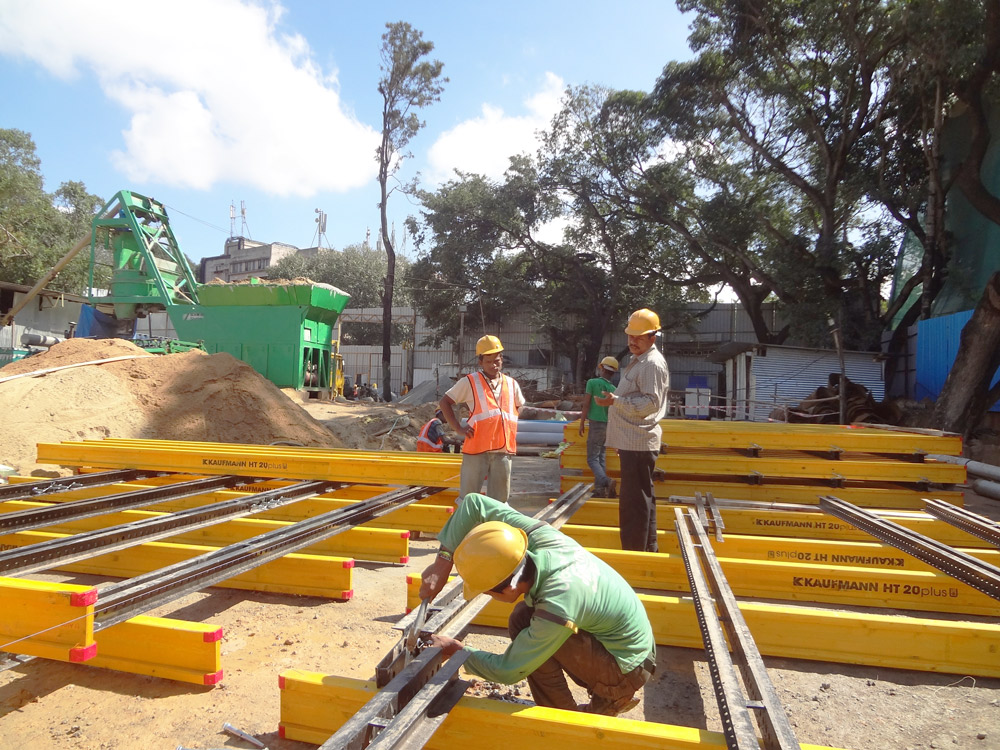 O núcleo central foi construindo-se em todo momento em um ou dois níveis acima das lajes. A cofragem ENKOFORM V-100 foi combinada com o sistema de consoles trepantes BMK na face exterior das muros e plataformas interiores KSP nas demais faces. O ciclo de betonagem por andar foi calculado em 9 días.