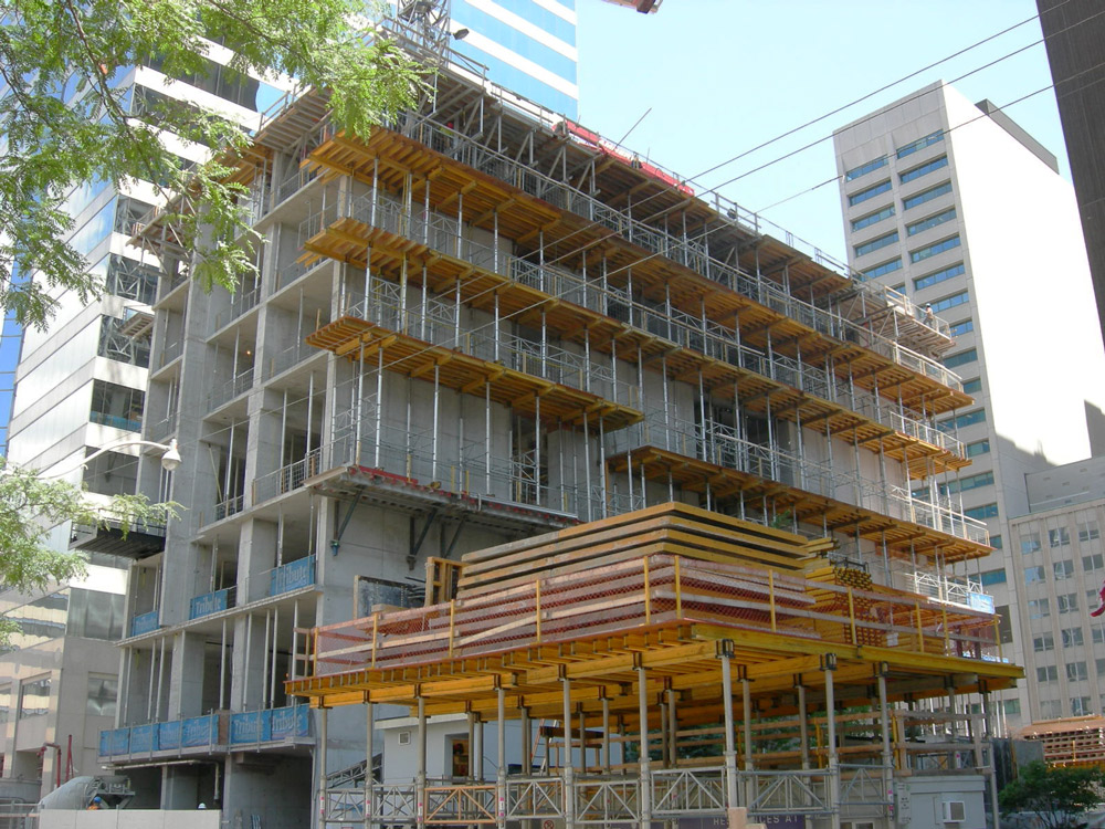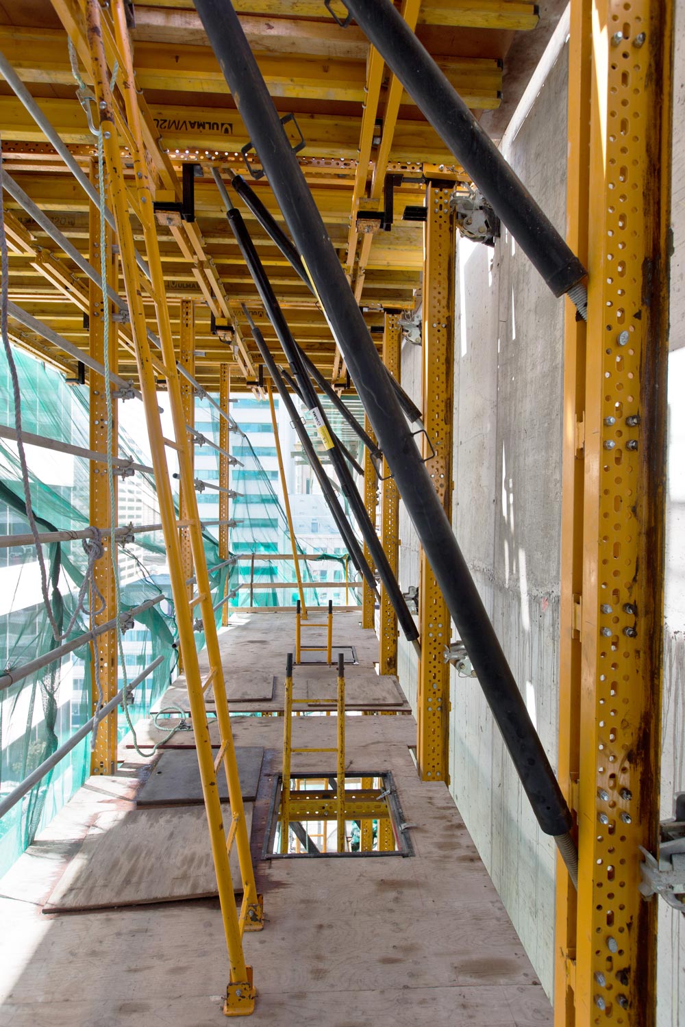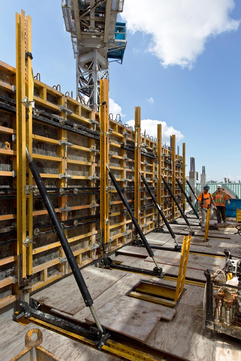 A ULMA colocou a disposição da obra o Sistema Trepante Guiado RKS, como plataforma para a cofragem das muros externas e a proteção perimetral HWS.