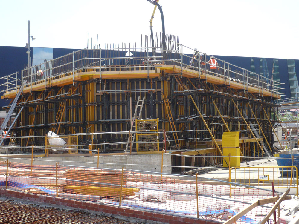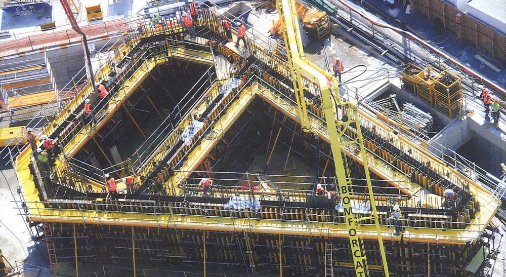 O núcleo central tem dois andares e foi executado antes das lajes com o Console Trepante 2000 e ENKOFORM V-100. Grande parte das lajes foram construídas com cofragem horizontal RAPID e em alguns casos com ENKOFLEX.