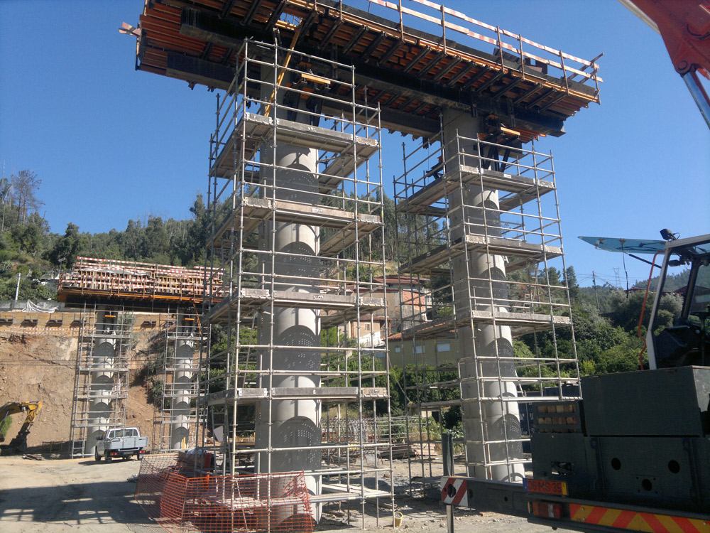 Nos tabuleiros dos viadutos, solucionamos o escoramento com Cimbre OC, nos casos de alturas inferiores a 20m. para alturas superiores a 20 m e terrenos instáveis optamos por asnas H33, CIMBRE T500, CONSOLAS MT80.