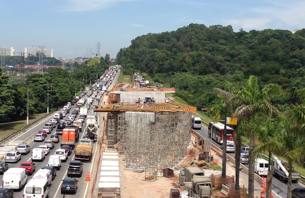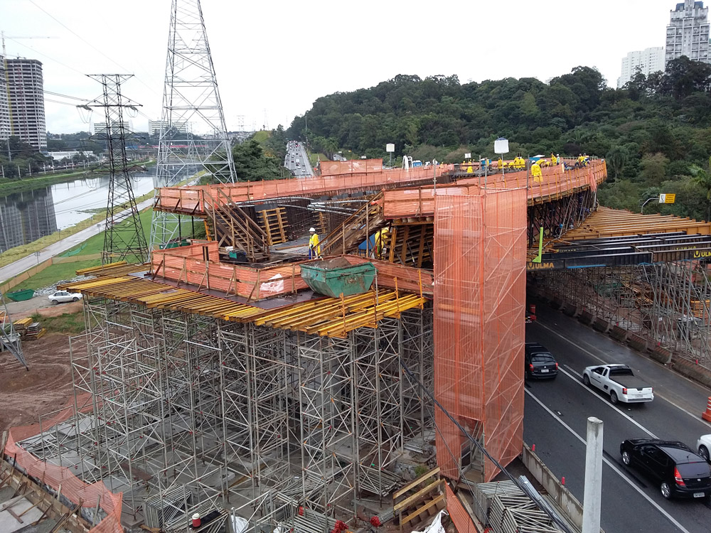 Devido ao grande fluxo de veículos da Marginal Pinheiros, e a impossibilidade de bloqueá-la, para solucionar o escoramento neste trecho, foram utilizados Perfis Especiais que passam por cima da pista expressa da Marginal, sentido Interlagos, e suportam a cofragem ENKOFORM para execução do fundo e muros do caixão da ponte, com excelente acabamento de betão visto. Nos demais trechos onde não havia fluxo de veículos, as torres de escoramento T-60 executaram com grande produtividade. O Cimbre BRIO resolveu o escoramento interno do caixão da ponte com seu sistema ligeiro e produtivo.