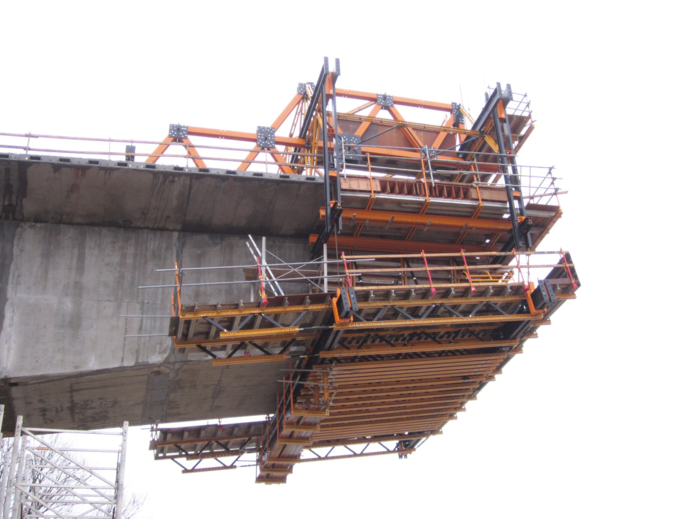 Pilares de 15 a 18 m de altura foram realizados com a cofragem ORMA em conjunto a Consoles Trepantes CR-250. Em um único movimento da grua, cada conjunto é movimentado a nova área de betonagem, juntamente com suas ampliações de plataforma.