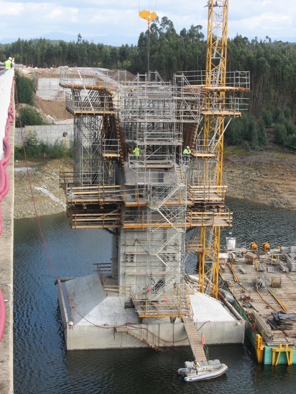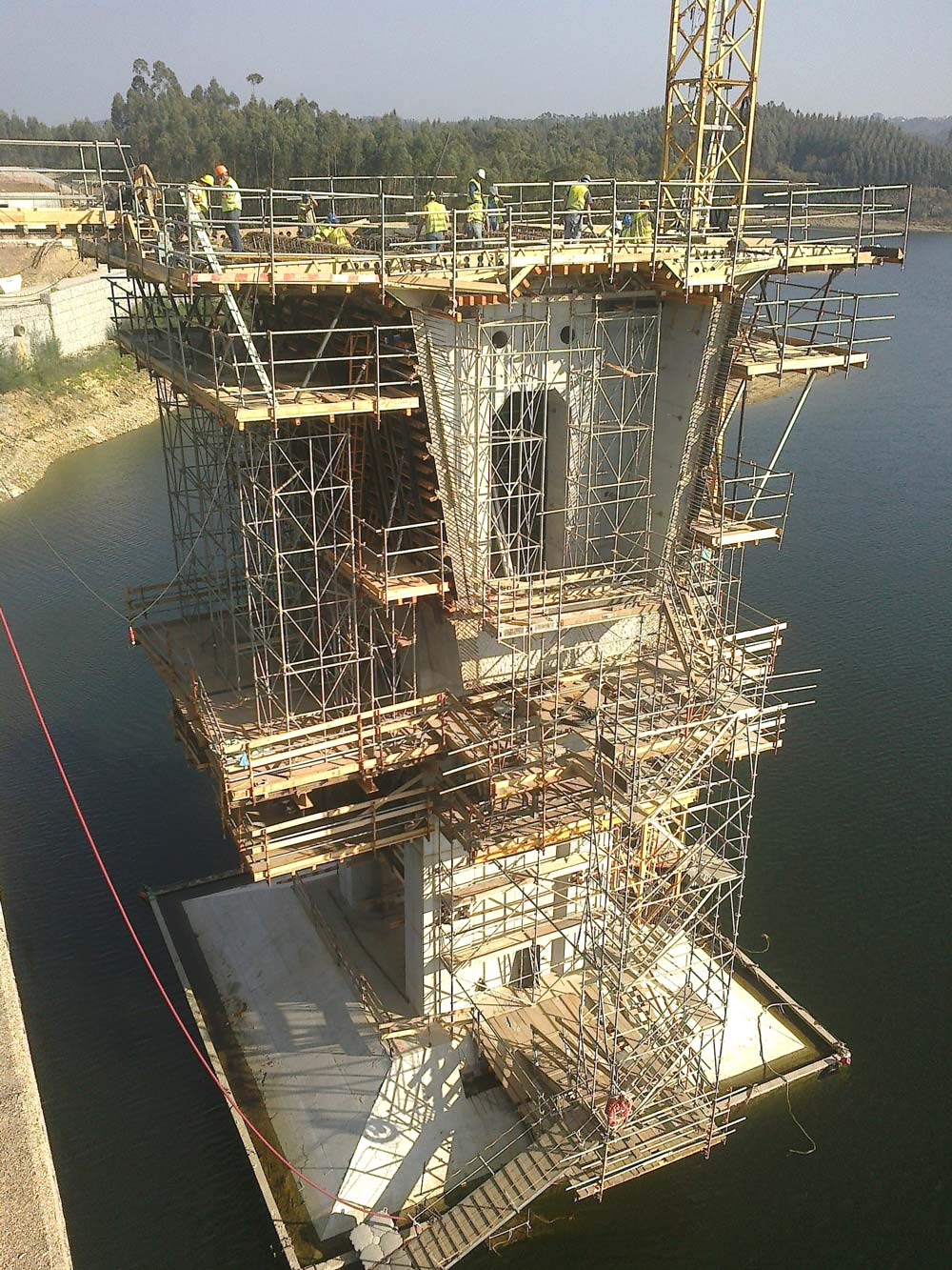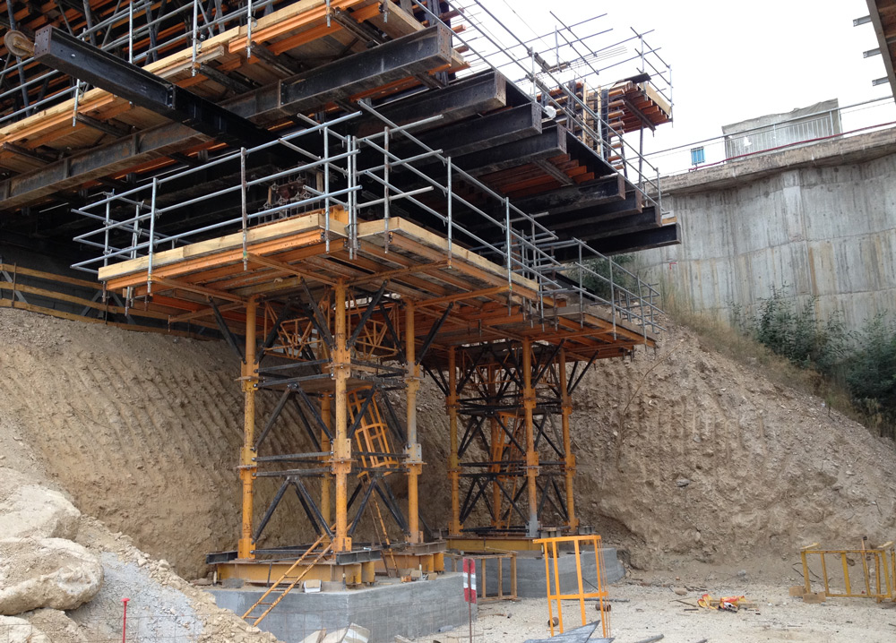 Tabuleiro: Para o primeiro tramo, definimos como solução dois pórticos de perfis apoiados em cimbre OC e T500. Para o segundo tramo todo o escoramento foi realizado em T500. Em ambas as situações o sistema de cofragem foi o Enkoform- H120.