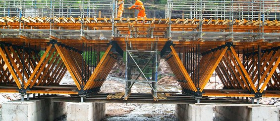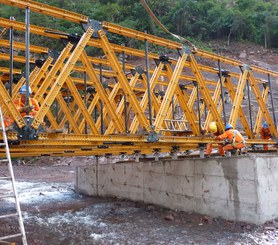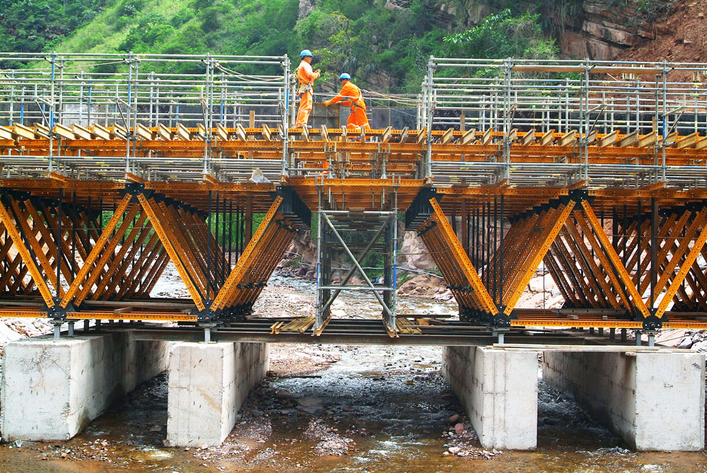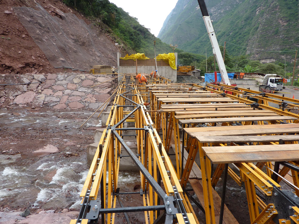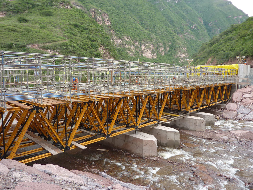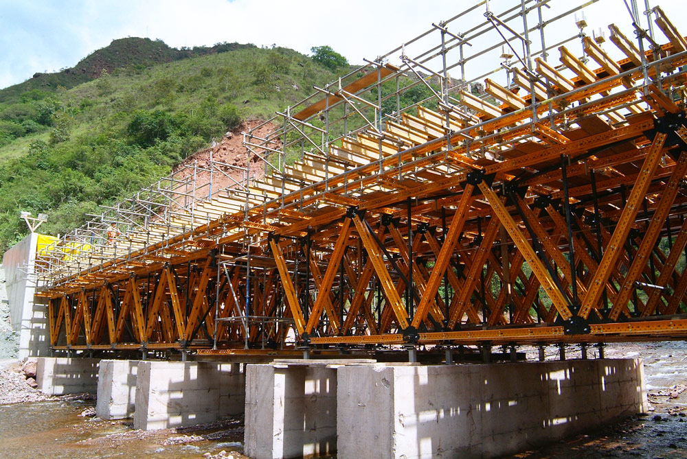 Foram montadas estruturas com Treliças MK. De 2,6 m de largura e bem fixadas, foram instaladas sobre as bases de betão no leito. Como base para o Cimbre BRIO, se colocaram Riostras MK em perpendicular, que serviram de apoio as vigas de madeira VM-20. Sobre esta base, a cofragem portátil COMAIN cobriu os laterais e fundos de viga.