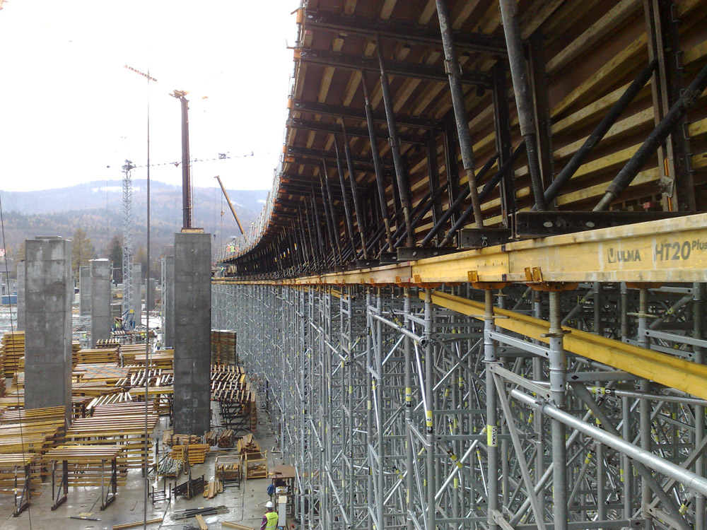 Como sistema de cofragem para o tabuleiro foi utilizado o ENKOFORM HMK, adaptável a qualquer seção com peças padrão. Em escoramento, o Cimbre T-60 acelerou o processo construtivo, bem como transmitiu as cargas de forma segura, a mais de 15 m de altura.