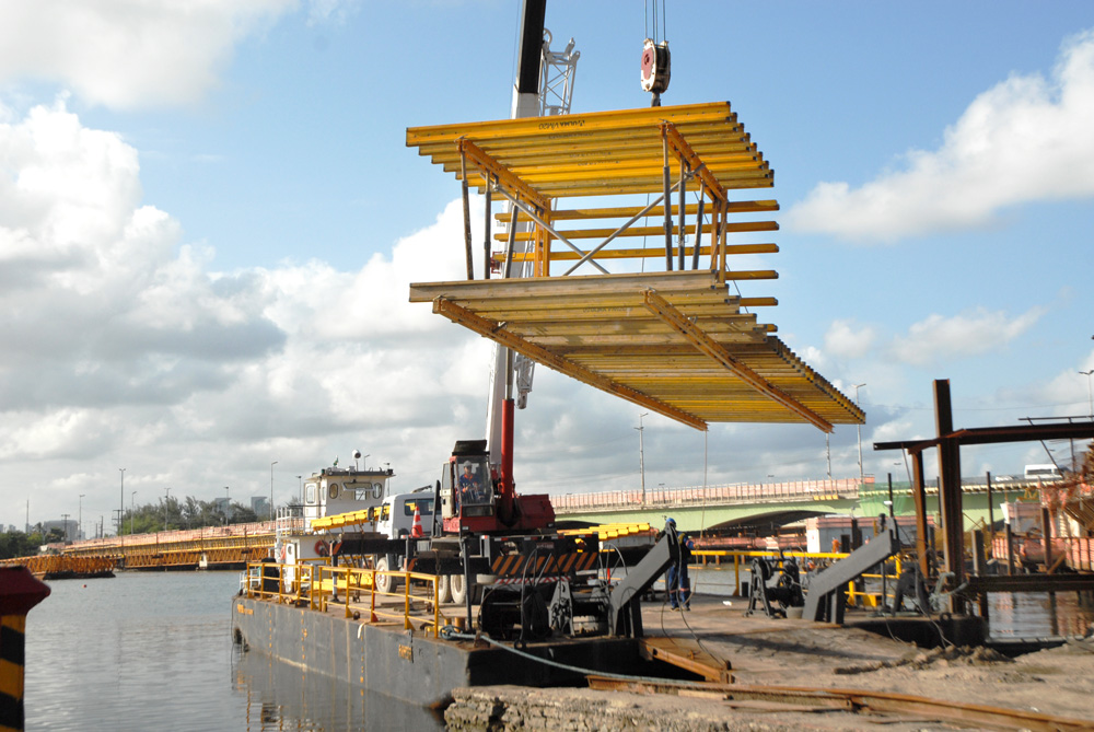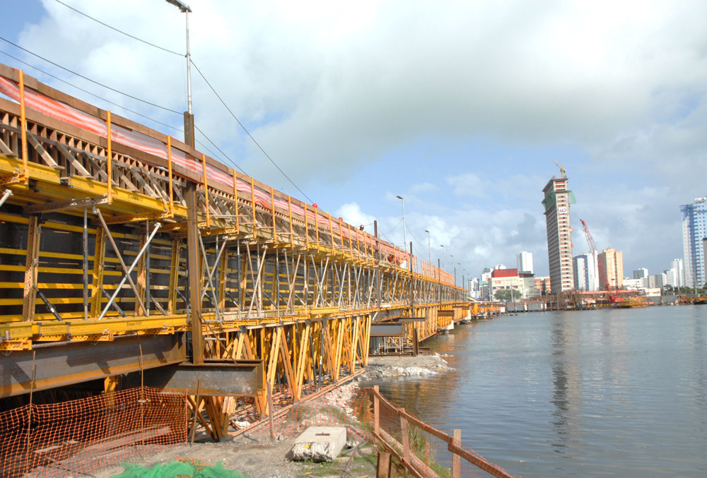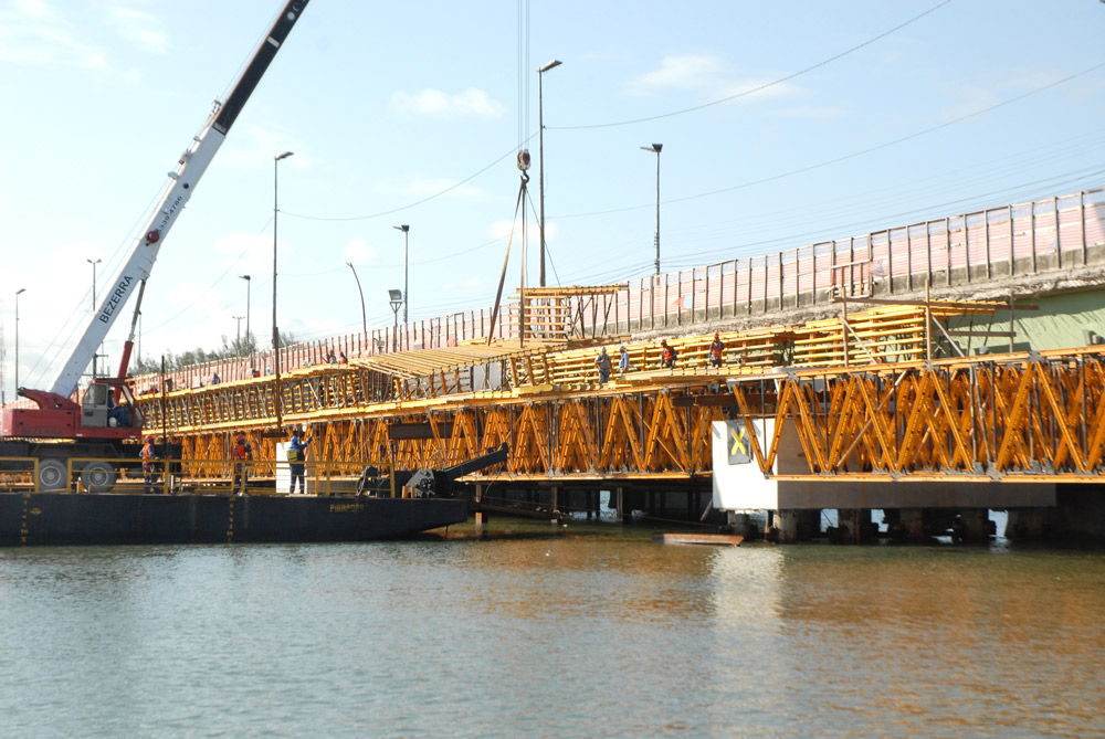 A estrutura do tabuleiro e do alargamento da ponte teve seu escoramento executado com Treliças MK, graças a capacidade de carga deste sistema, foi possível vencer vãos entre blocos de fundação sob o leito do rio de até 47m, com estacas de apoio ao centro do vão. Em alguns outros trechos apoiados em também foram utilizados os escoramentos Cimbre BRIO e as Prumos de Alumínio ALUPROP.