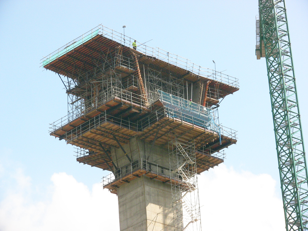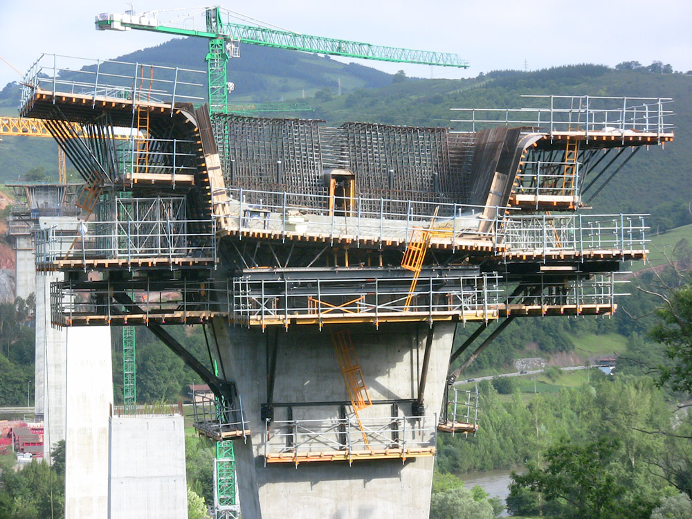 A cabeça do pilar, a aduela 0, foi executada sobre Console G, juntamente com a cofragem ENKOFORM H-120. Algumas laterais de 9 m de altura se concretaram em duas fases.