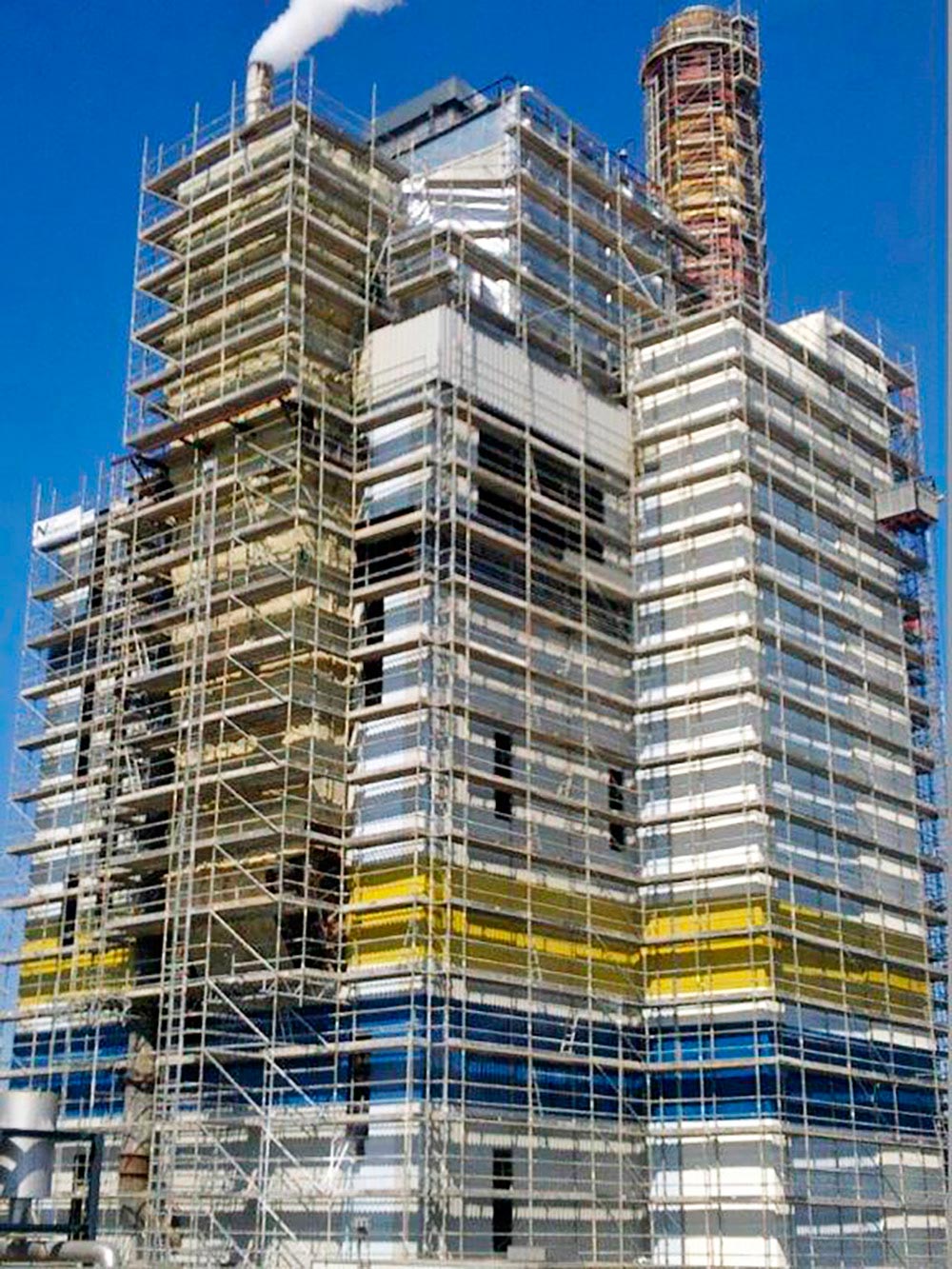 Reabilitação e manutenção de fabrica de papel em Viana do castelo. Necessidade de grande volume de equipamento e projecto técnico complexo. Trata-se de um edifício fabril com 40 metros de altura e a sua chaminé com 98 m. A ULMA colocou 4.000 m2 de andaime BRIO, diferenciou-se pela sua capacidade de fornecimento rápido, elevada capacidade de montagem e soluções de engenharia arrojadas mas simples de aplicar.