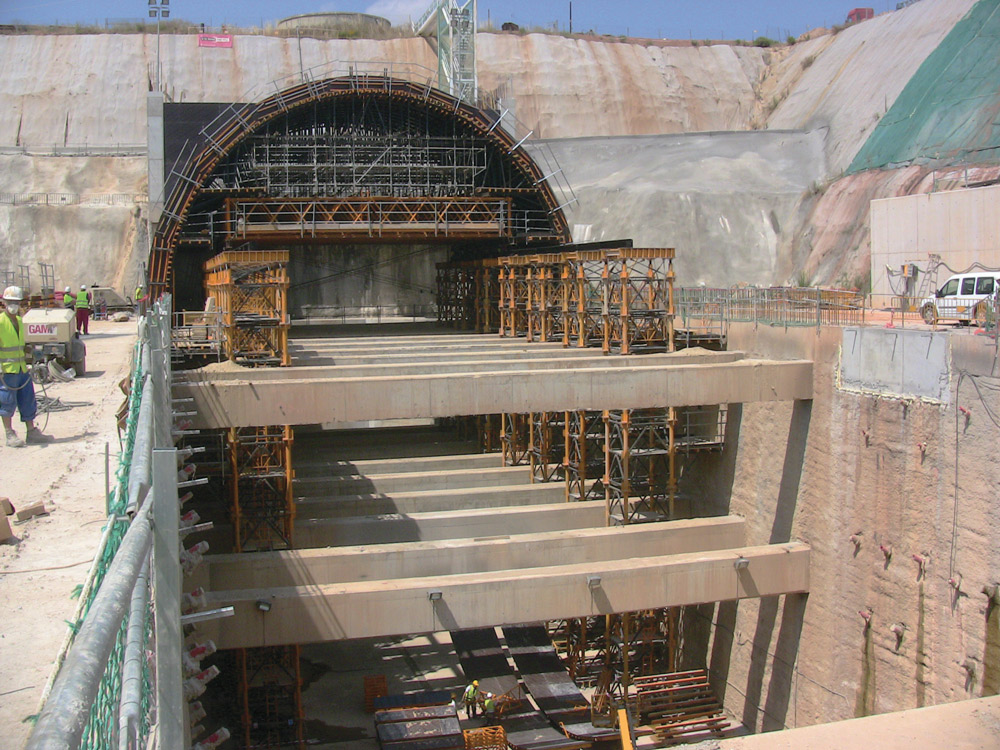 O carro, 14 m de comprimento e 22 m de diâmetro de cúpula, cobriu um comprimento de 130 m em concretagens sucessivas de 12,35 m.