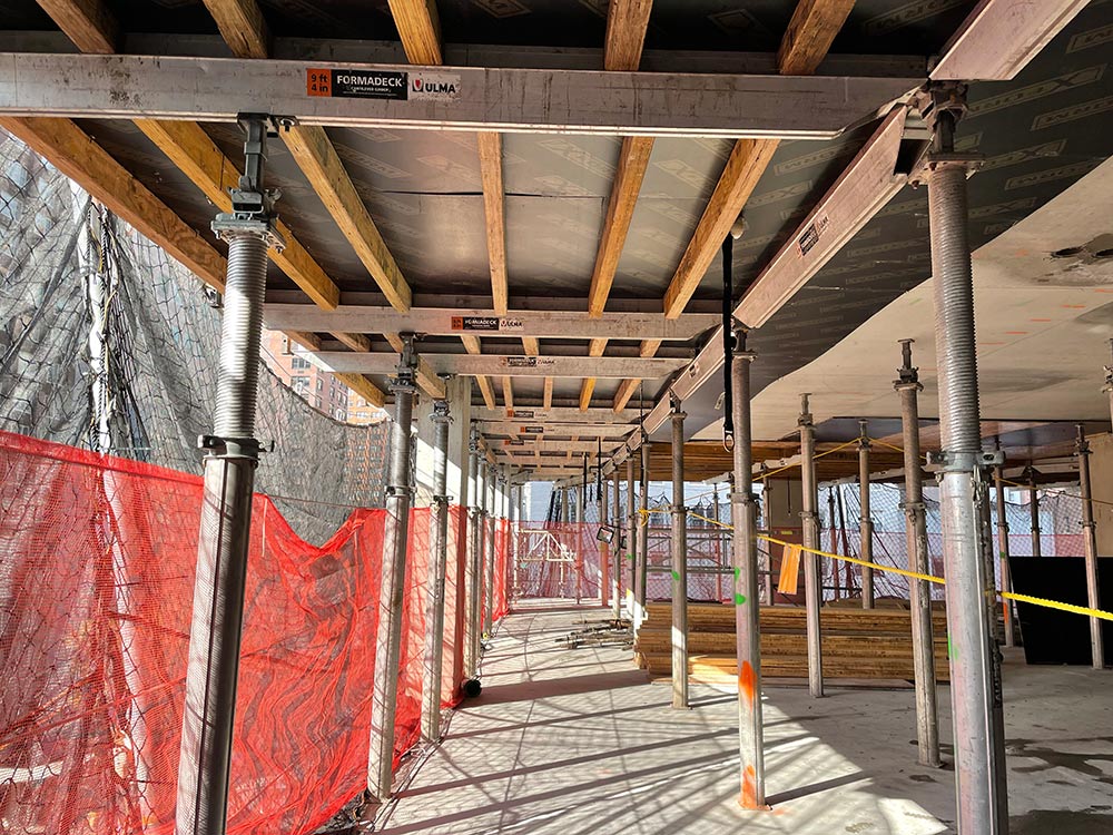FORMADECK proporciona um método rápido e eficaz para a cofragem de grandes superfícies, e ENKOFLEX oferece versatilidade. Estes dois sistemas permitem solucionar praticamente qualquer situação de forma segura e eficiente. Neste caso, o escoramento mínimo era de 2,9 m e o máximo de 4,9 m.