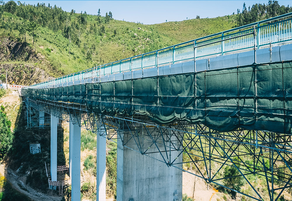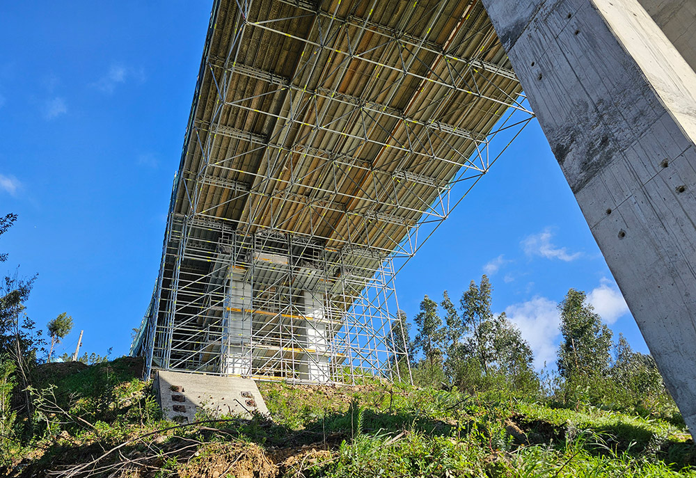 A solução desenvolvida pela ULMA consistiu numa plataforma de trabalho contínua, composta por Andaime Multidirecional BRIO em balanço e suspenso a partir do tabuleiro da ponte. Esta plataforma, com 12 metros de largura e distribuída por 19 vãos de aproximadamente 20 metros de comprimento, proporcionou acesso total a todas as zonas de intervenção sem interromper a circulação. Além disso, a ULMA projetou e forneceu soluções de cofragem específicas para a execução de vigas carlinga e estruturas de betão associadas ao reforço da ponte.