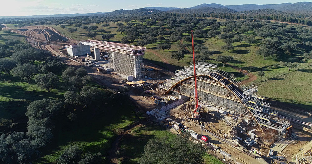 No Trecho Alandroal – Linha do Leste, fornecemos sistemas de cofragens e escoramentos para três viadutos, 10 passagens inferiores e cofragem para muros em 13 viadutos: 25.000 m³ de Cimbre T-500, consoles e perfis, cerca de 1.000 m² da cofragem ENKOFORM e 3.800 m² de cofragem ORMA.