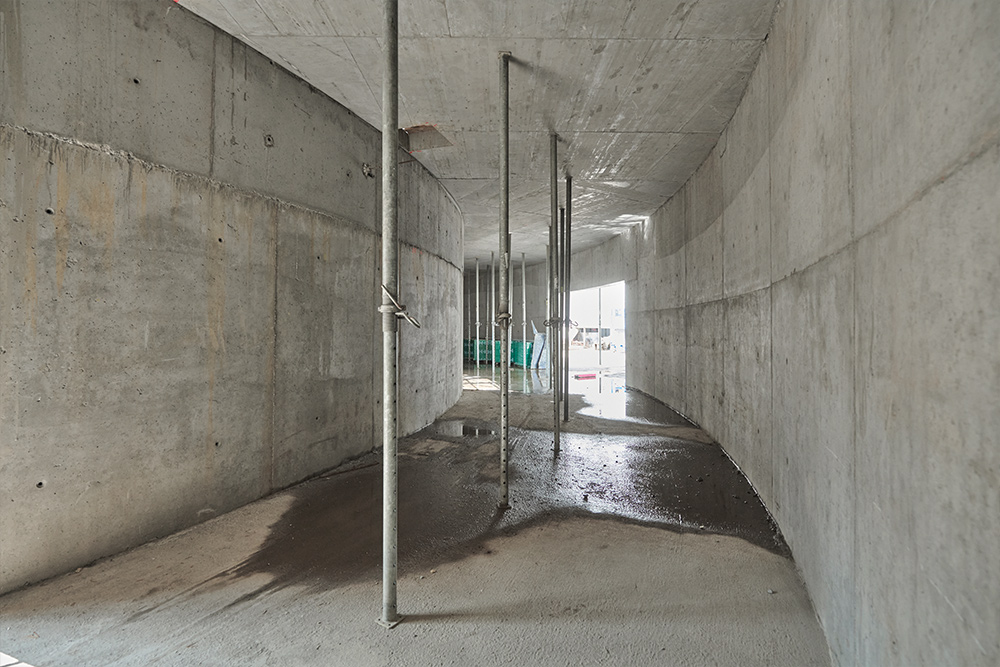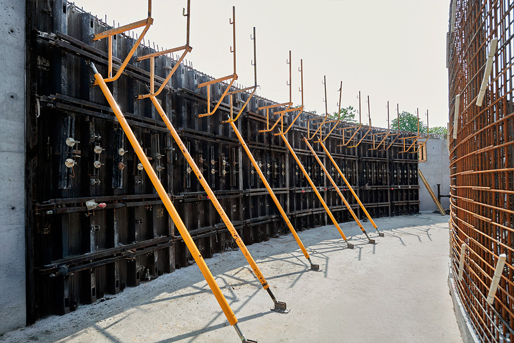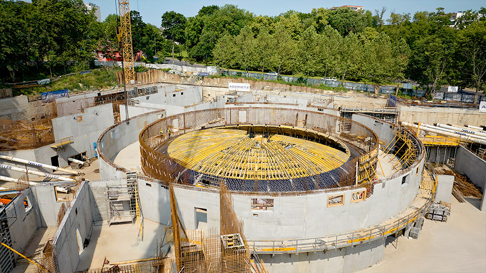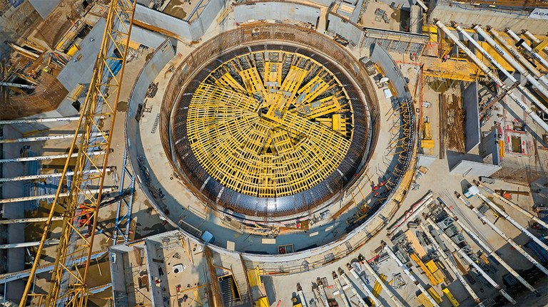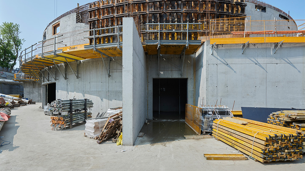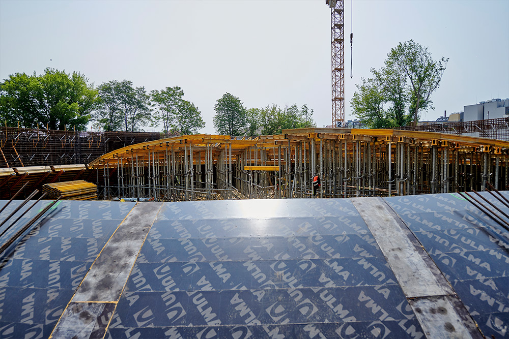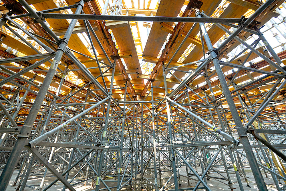 A complexidade da geometria exigiu um sistema de cofragem de alta precisão. A ULMA desenvolveu uma solução baseada no Sistema MK e vigas VM‑20, com componentes personalizados e pré-montados para definir com exatidão as nervuras de suporte da cúpula. O suporte foi resolvido com torres de cimbre T‑60 e escoras, enquanto a cofragem para as nervuras de betão foi projetada com o sistema de vigas ENKOFORM. A execução foi planeada em várias fases, coordenando o projeto, a montagem e o fornecimento de equipamentos.