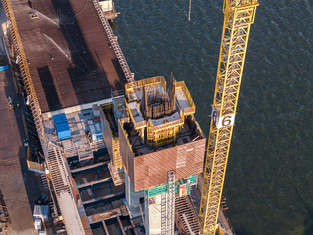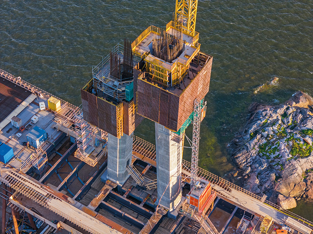 O troço inicial em forma de “V” foi realizado com uma cofragem capaz de se adaptar a múltiplas geometrias, ENKOFORM HMK, apoiada num conjunto de escoras T-60. À medida que o pilar aumentava de altura, a cofragem foi adaptada às secções variáveis até atingir 31 m. Na segunda fase, a estrutura em forma de “A” foi realizada combinando os sistemas autotrepantes ATR e KSP com cofragem HMK e plataformas de trabalho que garantiram eficiência e segurança na construção.