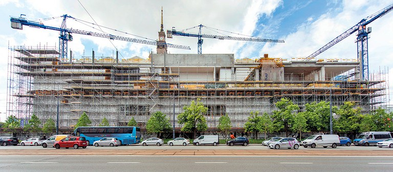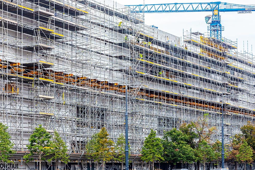 O apoio da fachada inferior, composto por um sistema de cimbre conjugado, evitou os efeitos do encurtamento elástico e os problemas com outros elementos estruturais do edifício, permitindo a instalação do andaime na fachada.