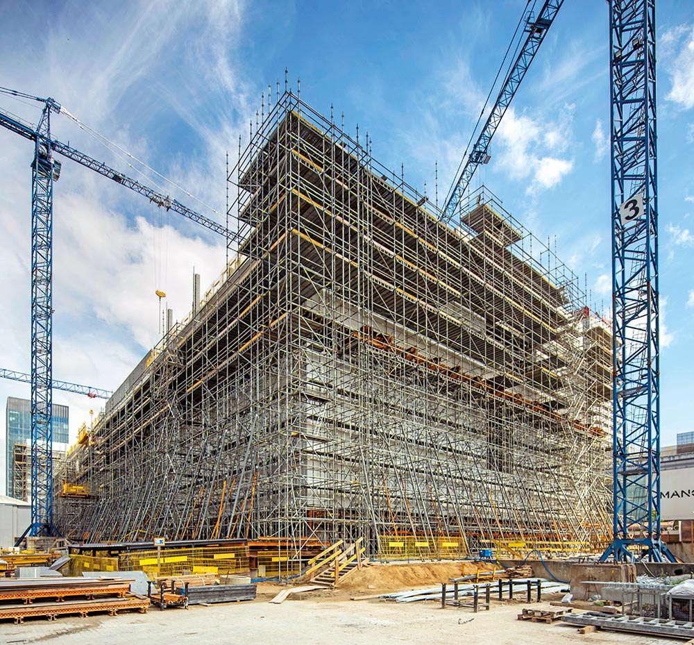 No perímetro do edifício, instalou-se simultâneamente um andaime de 25 m de altura, para garantir a segurança dos trabalhos e habilitar um espaço de apoio para as cofragens exteriores. Perante a impossibilidade de fixar o andaime à fachada, concebeu-se um sistema especial de ancoragens aproveitando os orifícios das barras roscadas. Esta solução melhorou a estabilidade do andaime durante a operação de descida da fachada.