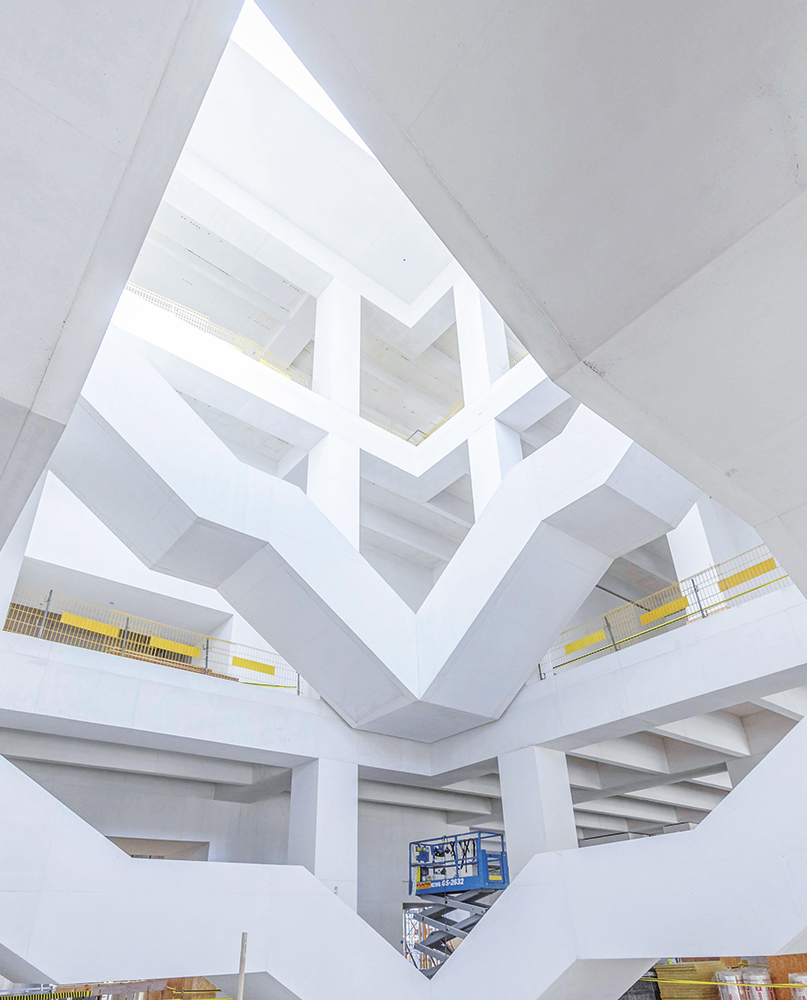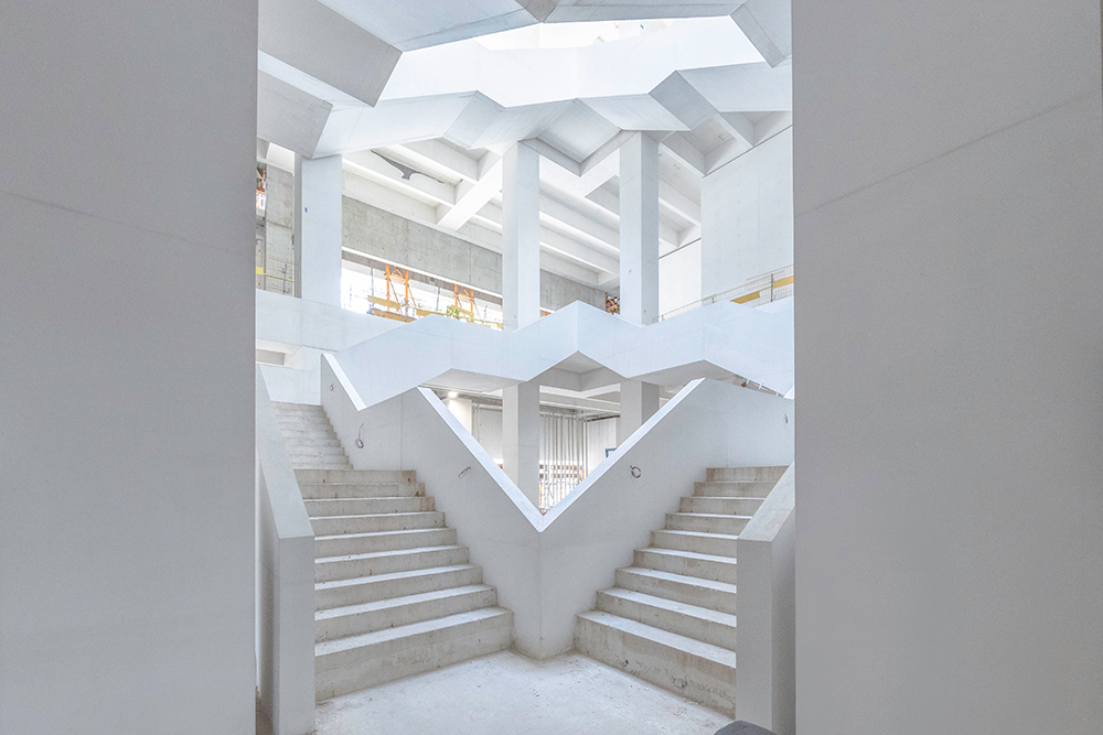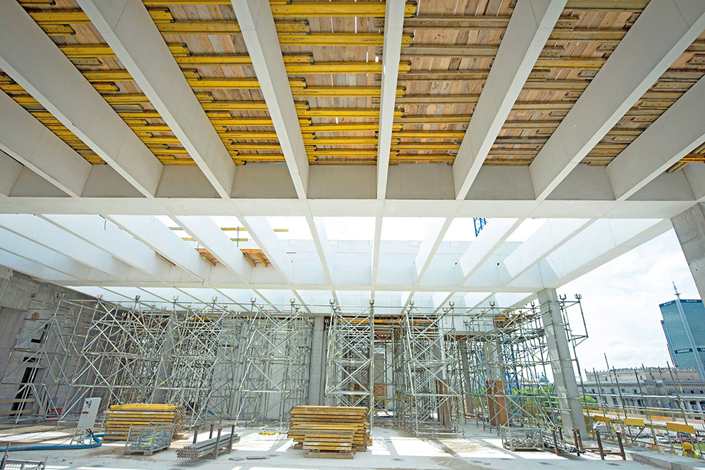 Os muros brancos de betão à vista combinam-se harmoniosamente com os espaços interiores do edifício cuja volumetria se integra perfeitamente no ambiente cultural da cidade. A equipa de engenharia de ULMA Polónia trabalhou continuadamente nos estudos e na aplicação de cofragens e andaimes, para assegurar a máxima qualidade das superfícies de betão. Além dos conhecimentos técnicos e da experiência, ULMA contribuiu também com a sua capacidade logística que, dada a grande envergadura do projeto e a sua complexidade, assegurou a entrega dos equipamentos seguindo um estrito cronograma e, sobretudo, tornou possível o fornecimento das estruturas de cofragem premontadas para a obra.