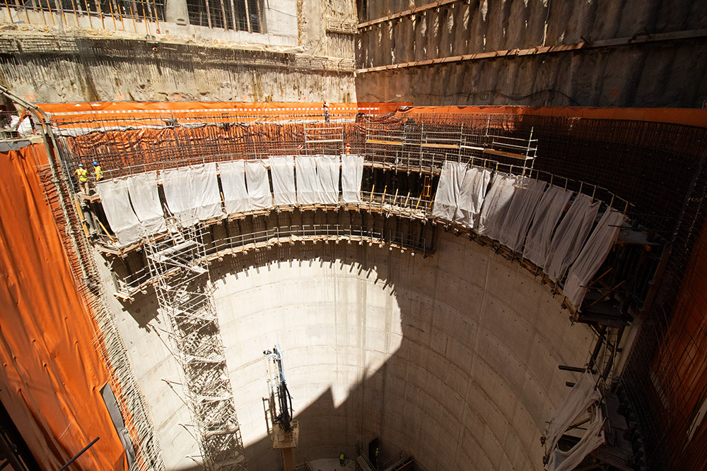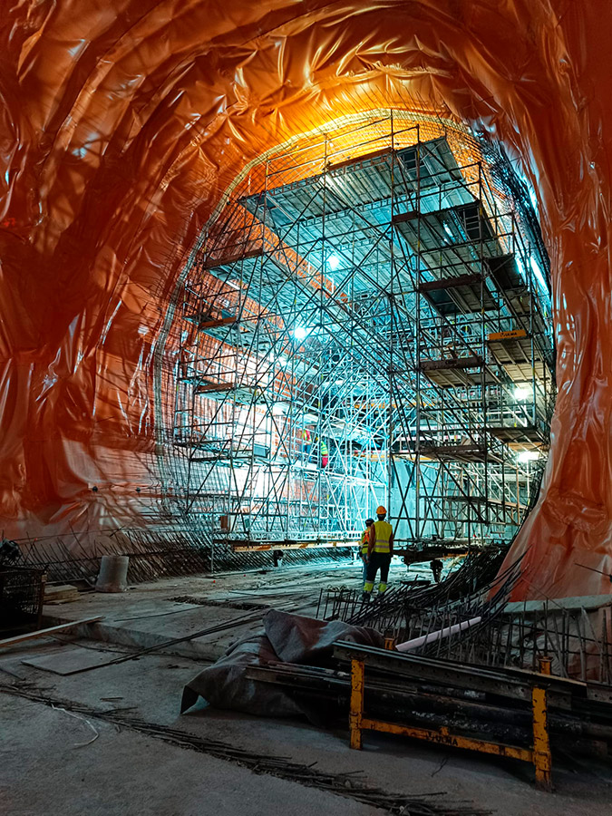 A colaboração entre a ZAGOPE e a ULMA em todas as fases do projeto foi fundamental, gerando soluções inovadoras que permitiram superar todas as dificuldades técnicas. Os sistemas de cofragem e escoramento da ULMA permitiram construir paredes retas e curvas, adaptando-se a geometrias complexas e a lajes de diferentes espessuras e suportando estruturas de grande dimensão. Os carros de andaimes BRIO, com capacidade para mais de 20 toneladas, foram essenciais para os trabalhos de armaduras, e os carros de cofragem MK para a betonagem das paredes do túnel, demonstrando a robustez e a versatilidade destes sistemas. A ULMA esteve presente desde a conceção inicial até à entrega final, contribuindo com a sua experiência para cada fase do projeto.