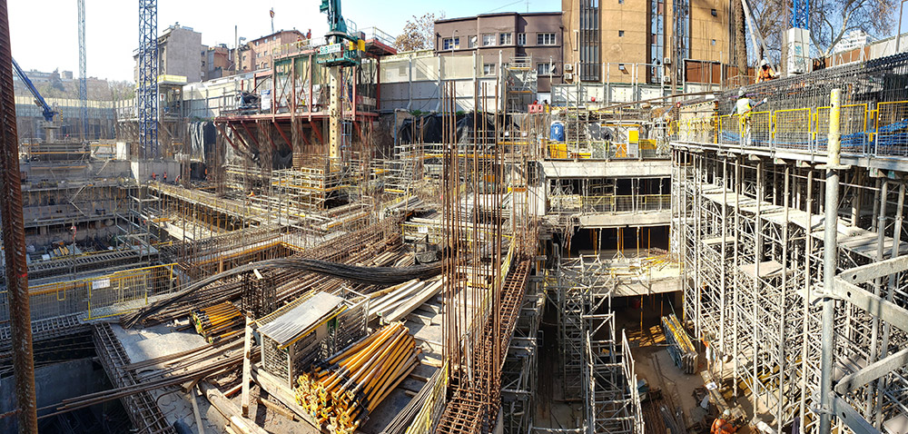 Para a execução das paredes e pilares, foram escolhidos sistemas robustos de cofragem vertical capazes de suportar elevadas pressões de betonagem, tais como cofragem modular ORMA que se destaca pelo seu elevado desempenho no local, juntamente com cofragem modular leve NEVI que tem sido a solução mais adequada para resolver as geometrias mais complexas deste projeto de construção. Enquanto para a execução de lajes o sistema escolhido foi o de cofragem de laje com vigas metálicas BTM, um sistema simples, prático e eficaz, que com poucos componentes pode facilmente adaptar-se a qualquer distribuição.