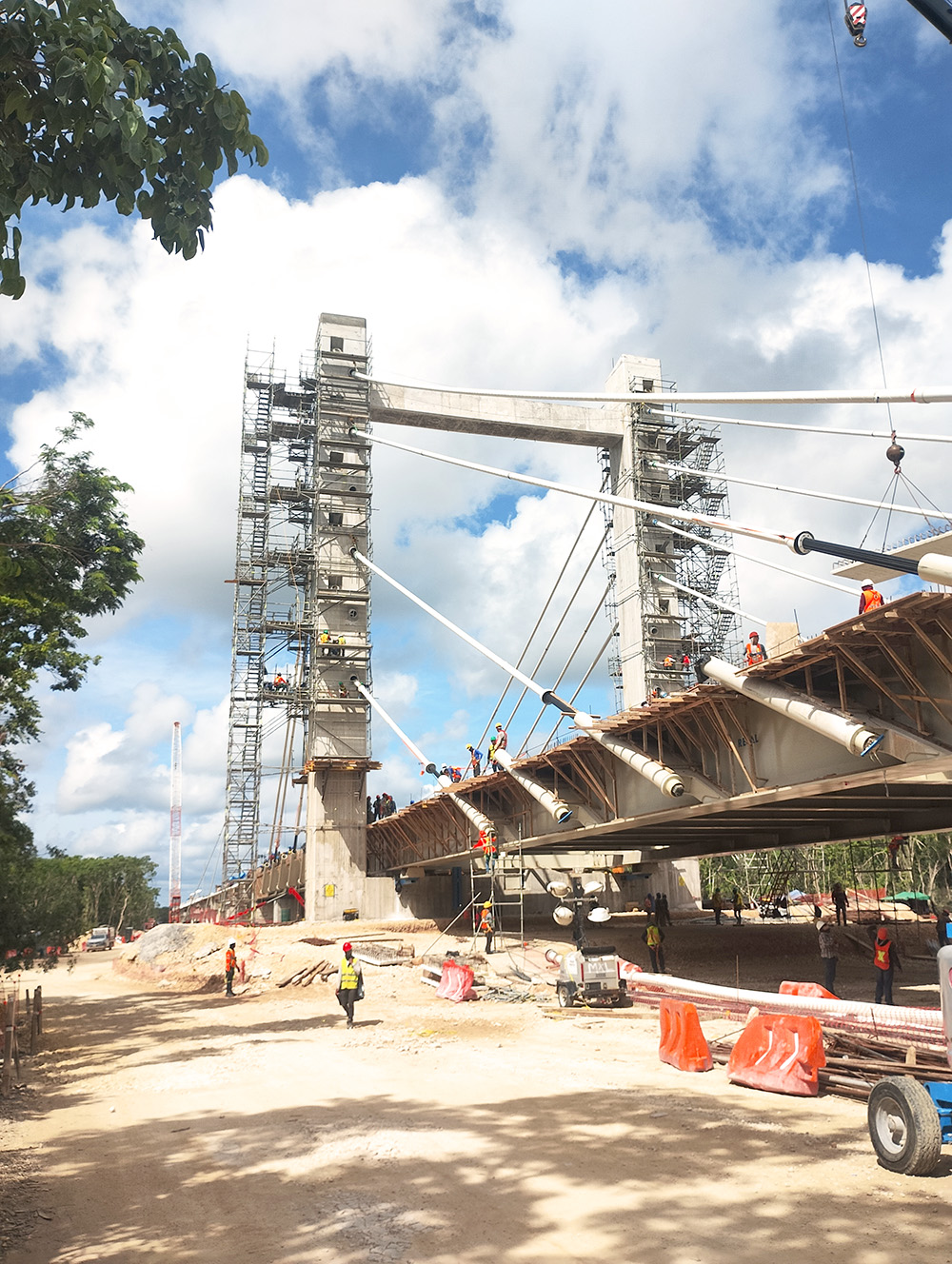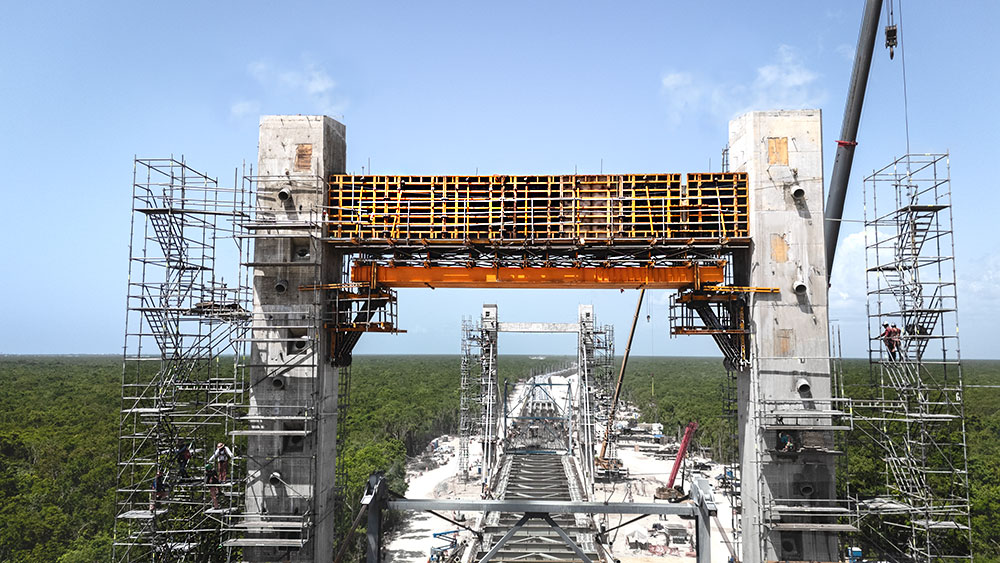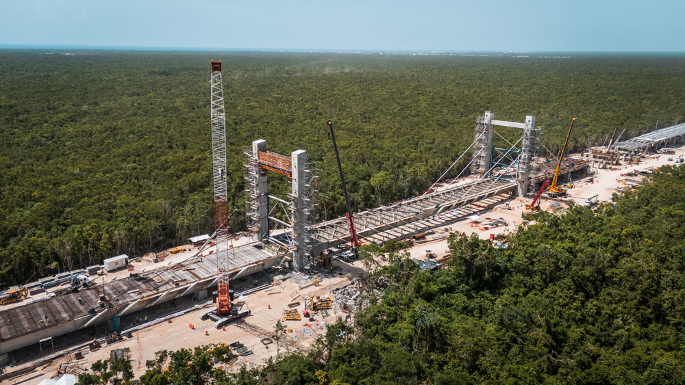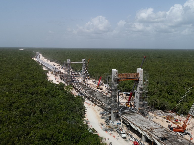 No Troço V, o trabalho apresentou desafios técnicos significativos devido à presença de solo cársico. Para ultrapassar estas condições geológicas, foram concebidos 42,1 quilómetros de via elevada e 25,6 quilómetros em terrapleno. Um dos destaques do troço é uma ponte estaiada de 266 metros, concebida para preservar a gruta Garra del Jaguar, em Tulum. Esta estrutura é apoiada em dois eixos principais, cada um constituído por um par de pilares de 33,40 metros de altura, ligados por uma viga de ligação com 17,50 metros de comprimento. Esta configuração estrutural assegurou a estabilidade da ponte e permitiu proteger o ambiente natural sem interferências.