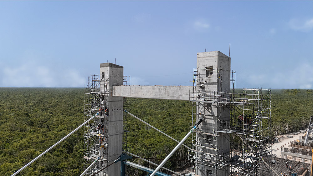 A ULMA apresentou uma solução integral de engenharia para a execução destes elementos. Os painéis ENKOFORM V-100 foram utilizados nas estacas, juntamente com os suportes trepantes CR-250, e assim foi possível avançar em fases de betonagem de 3,70 metros. Uma característica especial do projeto foi a integração de janelas no betão para permitir a passagem de tubos para o posterior tensionamento do sistema de cabos suspensos. Para a execução da viga de amarração, foram utilizadas consolas resistentes MK e perfis DIPE, ancorados diretamente nos pilares, o que permitiu cobrir um vão de 17,50 metros a uma altura até 28 metros, sem necessidade de apoio no solo. Como solução de cofragem segura e eficiente, foi proposta uma combinação de ENKOFORM H-120 e painéis modulares ORMA para a base e os lados da viga. Para facilitar o acesso seguro às consolas e às áreas de trabalho durante o tensionamento, foram instaladas escadas BRIO com 33 metros de altura. A ULMA forneceu estes sistemas como parte de uma solução global, com propostas práticas e eficazes orientadas para a otimização do fluxo de trabalho.
