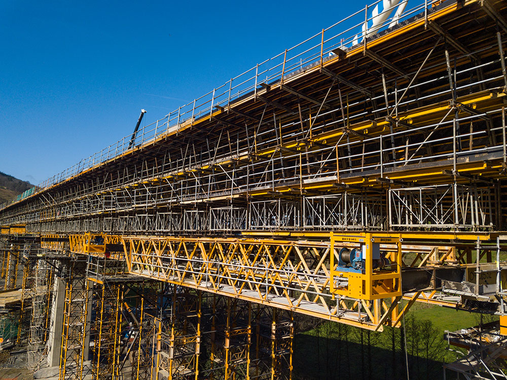 As soluções foram projetadas para reutilizar os sistemas em cada um dos trechos, embora os vãos não tivessem o mesmo comprimento. Dessa forma, foi possível executar todo o projeto com o mesmo material do início ao fim: 2400 toneladas de torres de escoramento, cofragens e treliças. O betão modular dos sistemas permite adequar às diferentes dimensões necessárias.