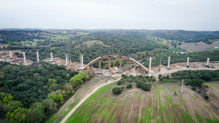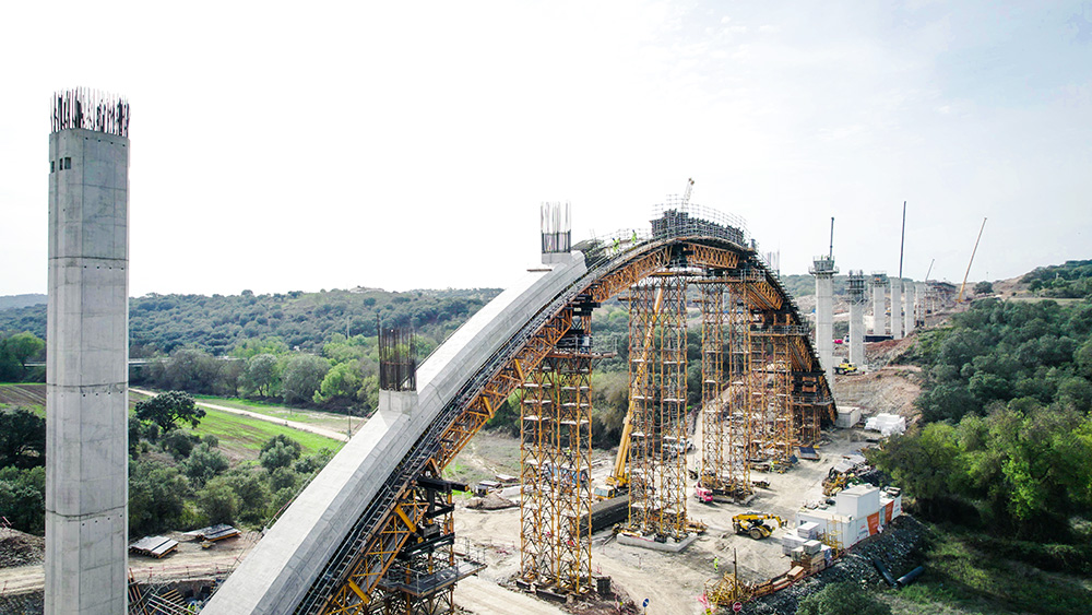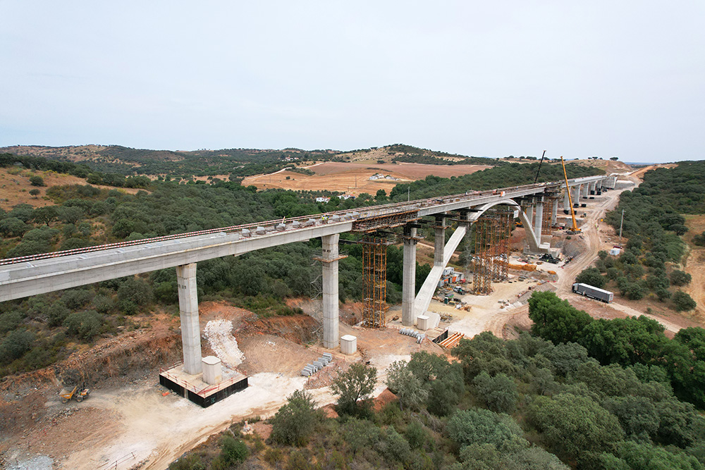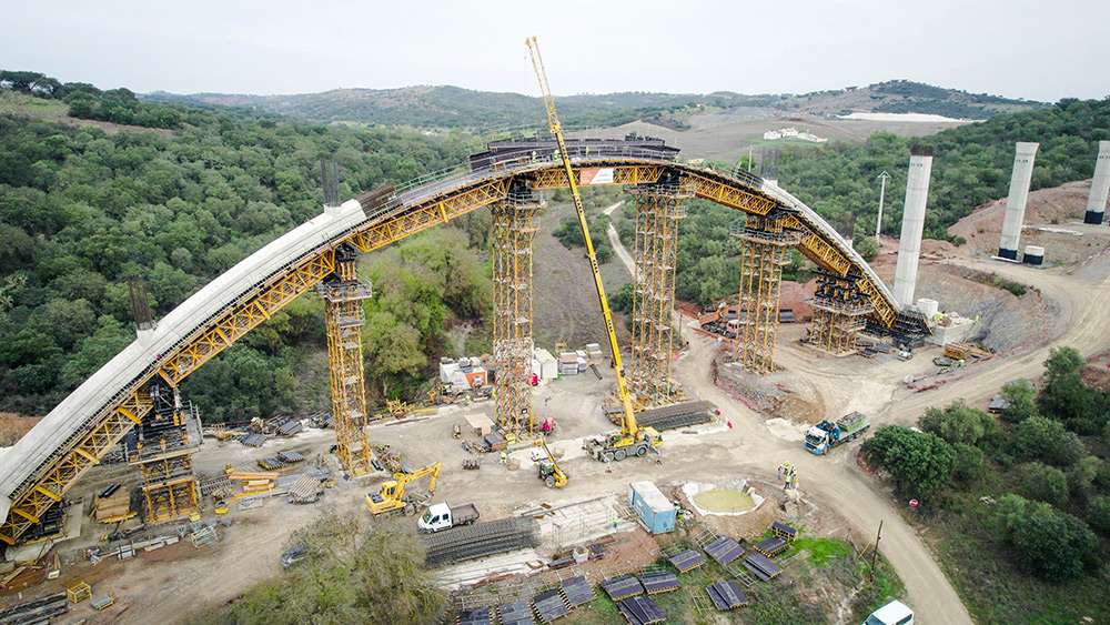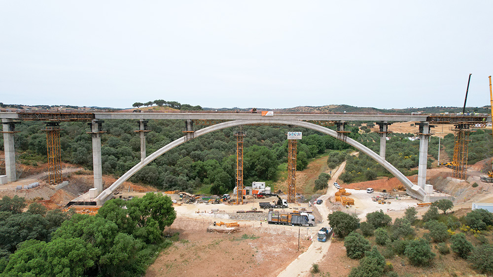 “A parte mais complexa da construção deste viaduto foi, sem dúvida, o arco. Devido ao seu processo construtivo, adaptamos o sistema de torre T-500, de grande capacidade, com treliças H 33 que permitem realizar grandes vãos. Desta forma, as torres foram posicionadas nos locais ideais para colocar macacos hidráulicos, de modo a que fosse possível corrigir as alturas/geometria dos dois semi-arcos. Por fim, fizemos uma viga central onde o arco foi tensionado e comprimido para que se possa travá-lo sem problemas de introdução de cargas imprevistas”, comenta Nuno Filipe, Diretor de Obra da Construgomes Engenharia.